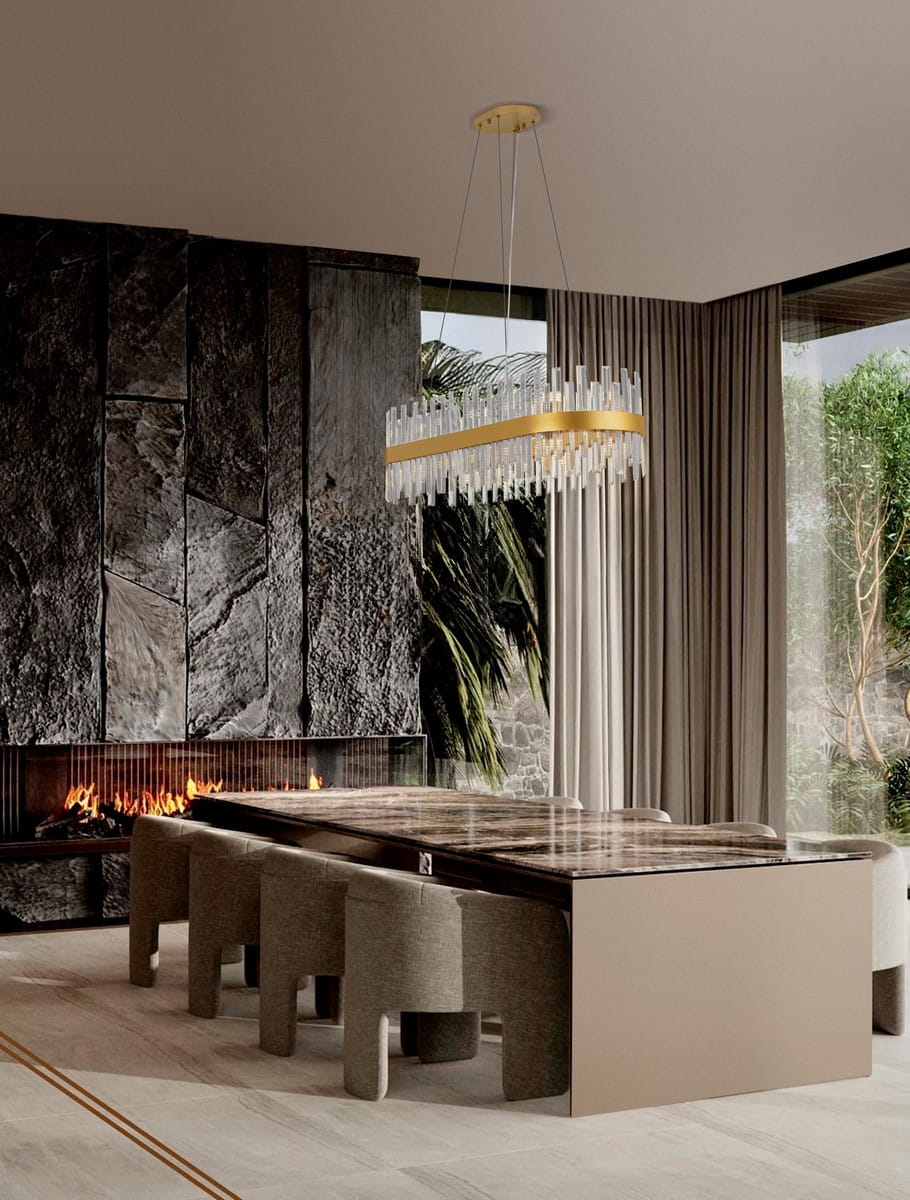Kryształy w kształcie smukłych, prostych brył pięknie rozpraszają światło, tworząc dynamiczne refleksy na ścianach i suficie, co podkreśla ekskluzywny charakter wnętrza.