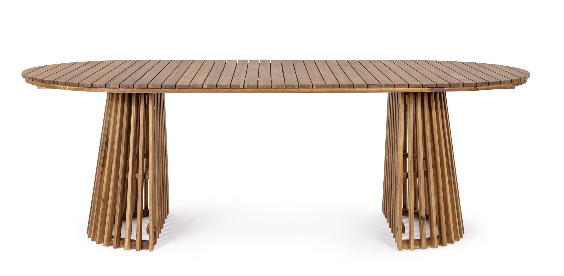 Dostępny w dwóch wariantach — okrągłym i owalnym — Rodano dopasowuje się zarówno do kameralnych spotkań, jak i większych przyjęć w ogrodzie. Ażurowa podstawa w formie drewnianych listew nadaje mu lekkości i architektonicznego wyrazu, jednocześnie zapewniając stabilność. Elementy konstrukcyjne zostały wzmocnione ocynkowanymi okuciami, co zapewnia trwałość w warunkach zewnętrznych. Podstawa wymaga prostego montażu.