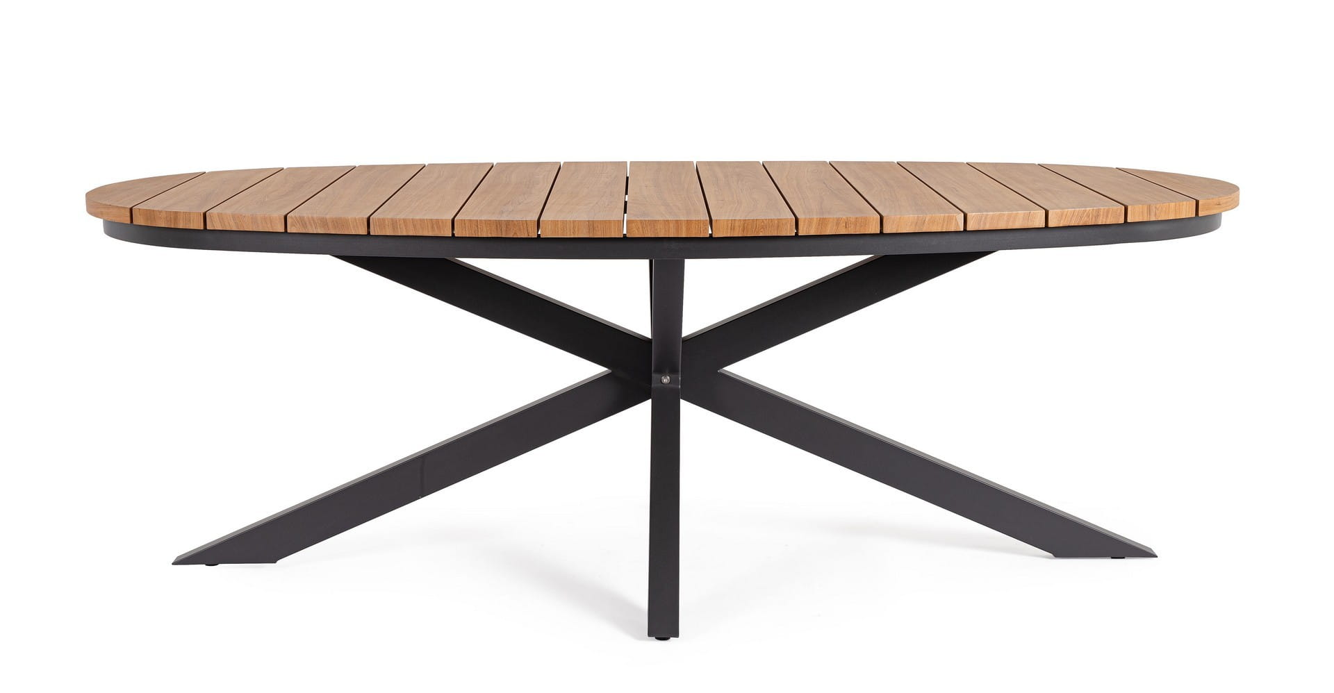 Blat wykonany z aluminiowych lameli pokrytych farbą imitującą drewno zachwyca naturalnym wyglądem i ciepłą kolorystyką, przy jednoczesnym zachowaniu odporności na warunki atmosferyczne. To praktyczne rozwiązanie, które nie wymaga regularnej impregnacji jak w przypadku naturalnego drewna, a przy tym prezentuje się równie efektownie. Nowoczesna podstawa w formie rozchodzących się promieniście nóg dodaje lekkości całej konstrukcji i stanowi oryginalny akcent stylistyczny.