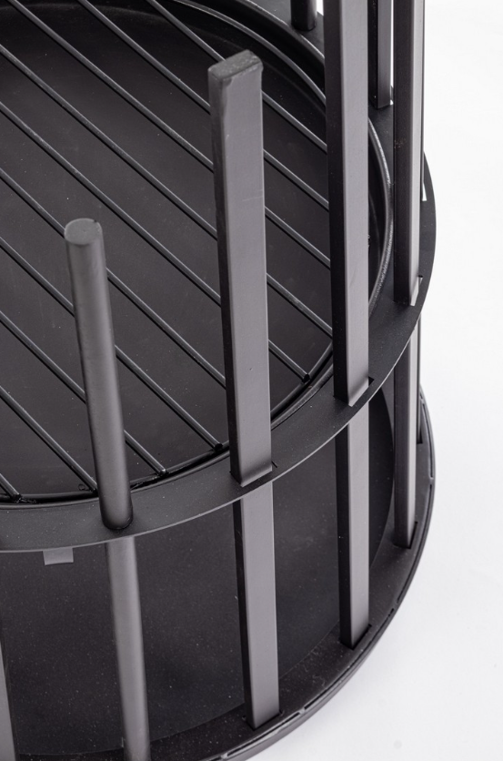Mebel został w całości wykonany z wysokogatunkowej stali malowanej proszkowo na głęboki, czarny kolor. Cała powierzchnia prętów oraz misa paleniska zostały zabezpieczone specjalistyczną powłoką odporną na bardzo wysokie temperatury. Gwarantuje to trwałość konstrukcji oraz zachowanie estetycznego wyglądu nawet przy częstym kontakcie z żywym ogniem.