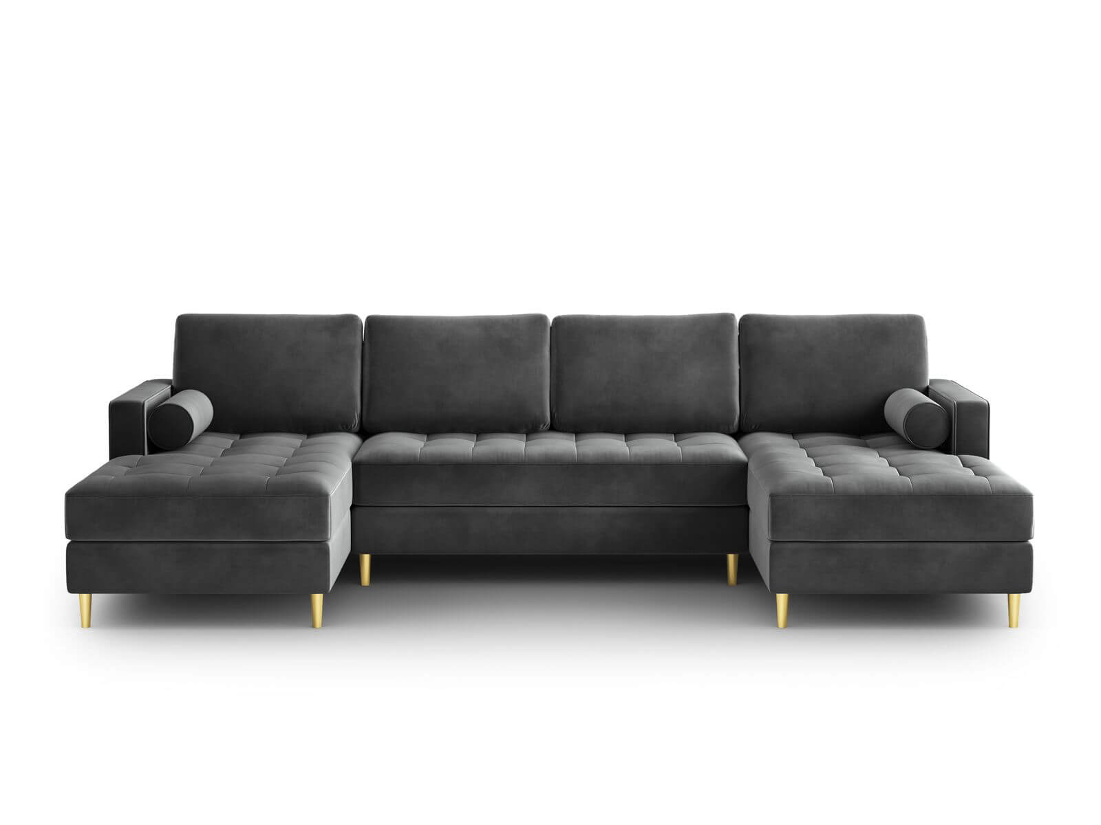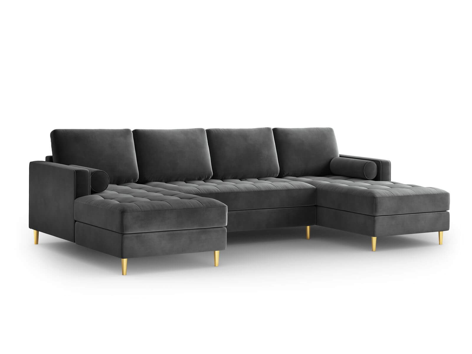 Panoramiczna sofa pikowana Santo ciemno szara na złotych nóżkach