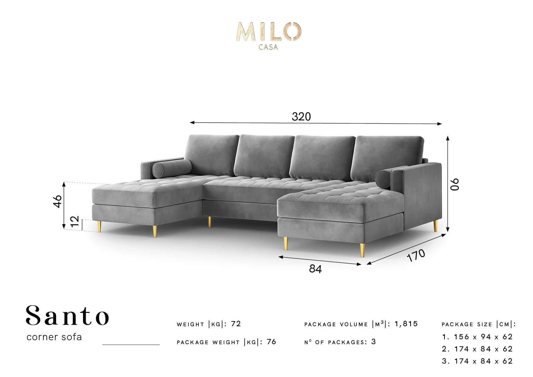 Kolor sofy panoramicznej Santo to ciemny szary - Salvador 18 (tkanina) oraz złoty (nóżki). Mebel oferujemy także na czarnych nóżkach oraz w innych kolorach.