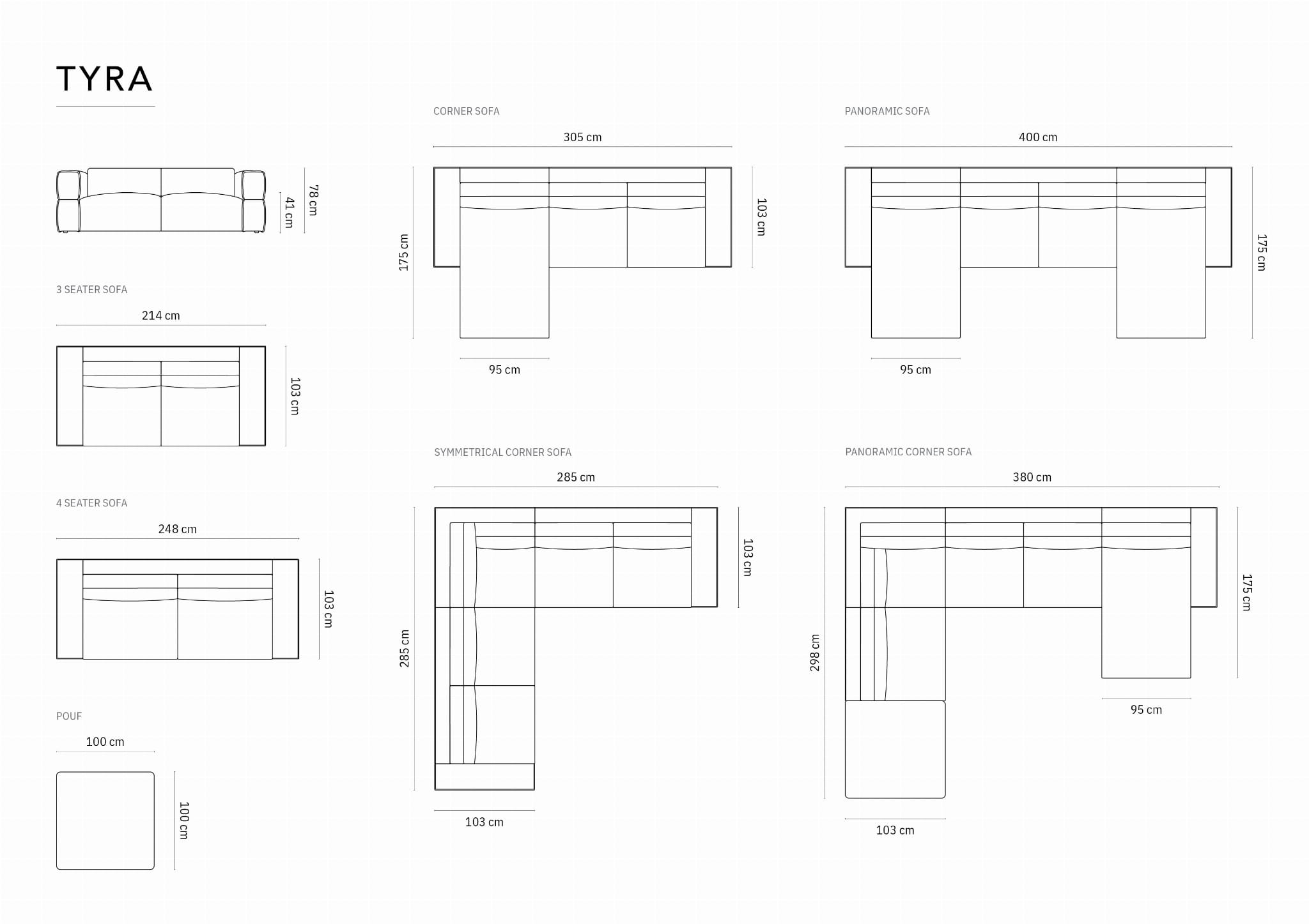Sofa panoramiczna Tyra jest tapicerowana tkaniną - Salvador 1. Tkanina obiciowa jest bardzo przyjemna i niemal jedwabista w dotyku (tzw. silk touch). Zastosowana w tkaninie technika LiquidBlocked utrudnia wchłanianie cieczy – powoduje, że ciecz gromadzi się na powierzchni materiału, nie wnikając w głąb włókien. Dzięki temu wylana na tkaninę kawa, herbata czy wino zostaną usunięte w ciągu kilku sekund przy pomocy lekko chłonnej ściereczki lub ręcznika papierowego. Pomyślnie przeszła test papierosowy, co oznacza, że jest odporna na zapłon płomienia i jest dodatkowo bardzo odporna na ścieranie (test Martindale 100 000, gramatura 340g/m2).