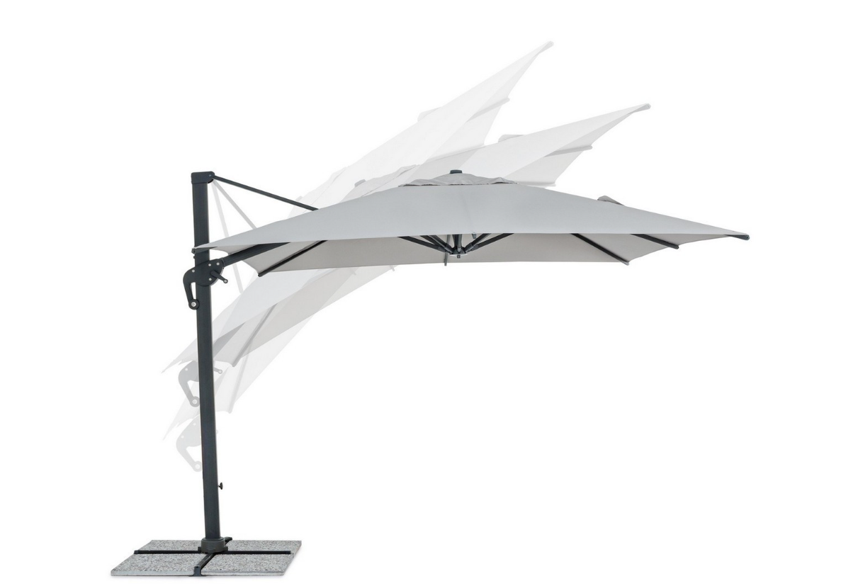 Czasza o powierzchni 9 m² wykonana jest z wysokiej jakości poliestru o gramaturze 250 g/m² z powłoką poliamidową (PA), co zapewnia jej trwałość i odporność na czynniki zewnętrzne. Dzięki umieszczeniu nogi z boku, przestrzeń pod parasolem pozostaje w pełni ustawna i wolna od przeszkód. Komfort użytkowania podnosi system obrotu o 360° sterowany pedałem oraz wygodny uchwyt umożliwiający 4-stopniową regulację nachylenia czaszy w pionie.
