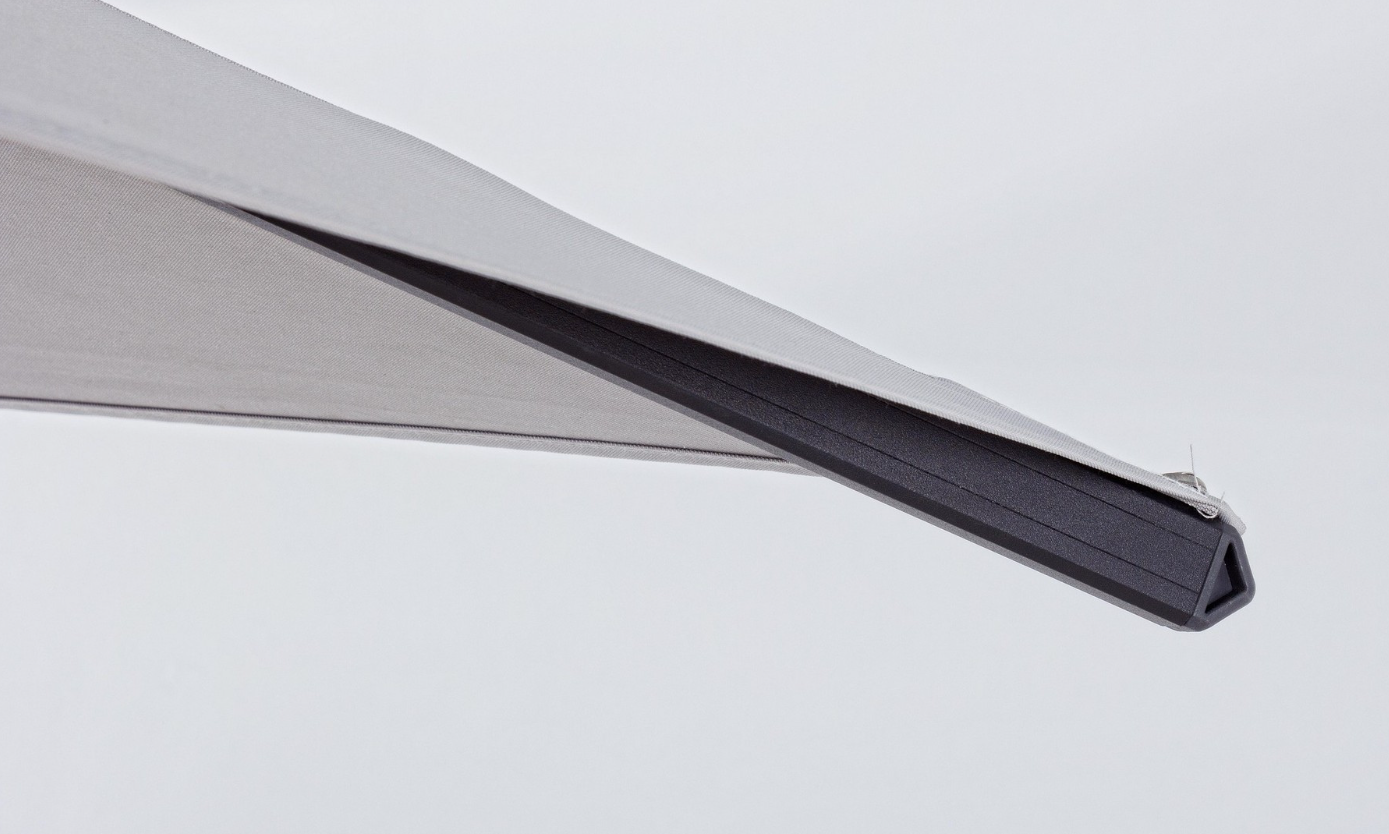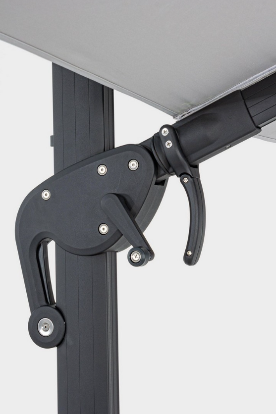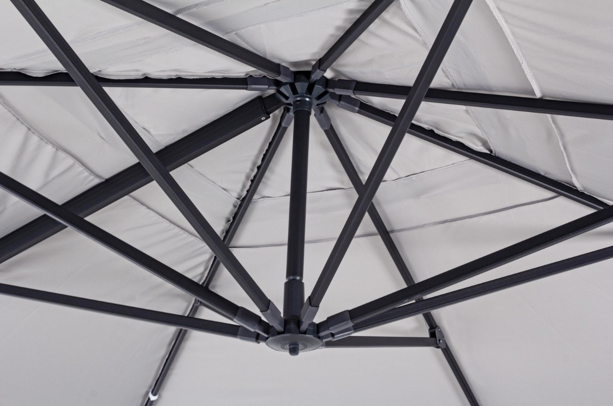 Parasol boczny Ines w wariancie T to propozycja dla najbardziej wymagających użytkowników, którzy oczekują nie tylko designu, ale i bezkompromisowej funkcjonalności. Model ten wyróżnia się nowoczesną estetyką opartą na kontraście: solidny, aluminiowy stelaż malowany proszkowo na kolor ciemnego antracytu zestawiono z jasnoszarą czaszą, co nadaje całości lekkości i elegancji.