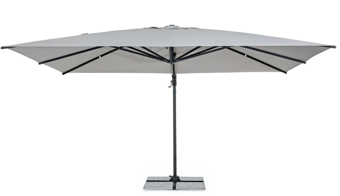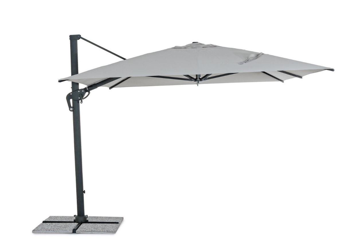 Oferujemy kompletny zestaw gotowy do użytku w ogrodzie. W cenie otrzymujesz stalową bazę, niezbędne betonowe obciążniki oraz dedykowany pokrowiec ochronny, który zabezpiecza parasol po sezonie. Parasol jest również przystosowany do montażu dedykowanego oświetlenia LED i głośnika.