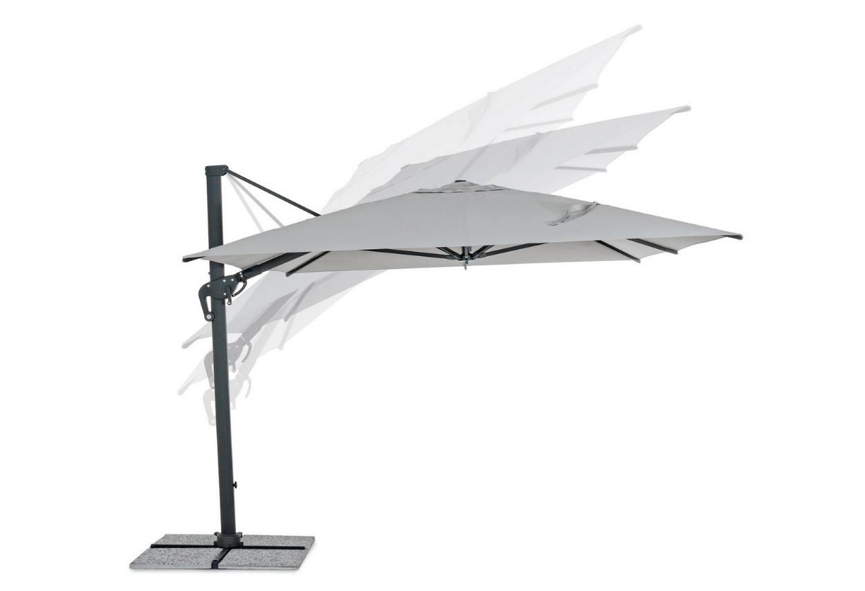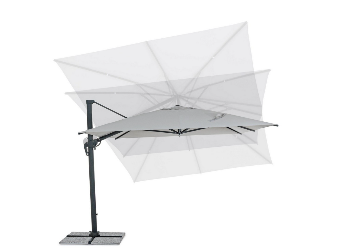 Największym atutem jest zaawansowany system regulacji 3D. Oprócz standardowego obrotu o 360° (sterowanego wygodnym pedałem) oraz 4-stopniowej regulacji nachylenia w pionie, ten model oferuje unikalną funkcję pochylania czaszy na boki (lewo-prawo). Dzięki temu możesz precyzyjnie osłonić się przed słońcem niezależnie od kąta jego padania, bez konieczności przesuwania mebli. Czasza o powierzchni 12 m² wykonana jest z wytrzymałego poliestru (250 g/m²) z powłoką PA, co gwarantuje trwałość i odporność na warunki atmosferyczne.