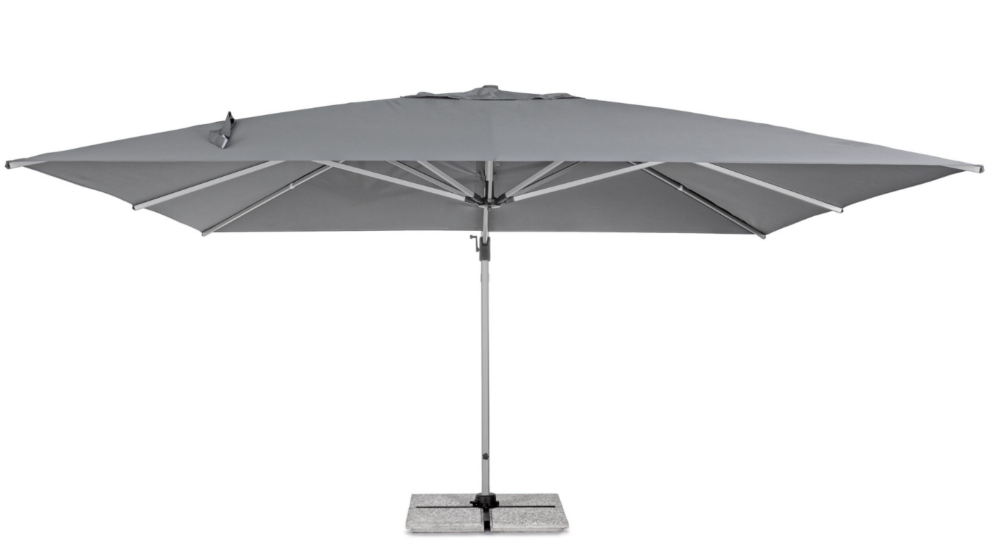 Ogromna czasza o powierzchni 16 m² w kolorze ciemnoszarym (Dark Grey) zapewnia cień nawet dla bardzo dużych zestawów wypoczynkowych. Wykonano ją z poliestru o gramaturze 250 g/m² z powłoką poliamidową (PA), co gwarantuje wytrzymałość i odporność na promieniowanie UV. Mimo swoich gabarytów, parasol jest niezwykle funkcjonalny: system obrotu o 360° obsługiwany pedałem oraz 5-stopniowa regulacja nachylenia pionowego pozwalają na precyzyjne sterowanie cieniem o każdej porze dnia.