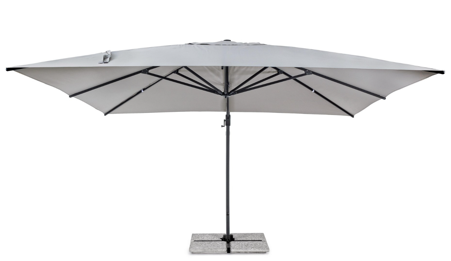 Oferowany zestaw jest kompletny i gotowy do użytku. Oprócz parasola i stalowej bazy, zawiera on niezbędne betonowe obciążniki (rekomendowane dociążenie dla tego rozmiaru to min. 160 kg) oraz dedykowany pokrowiec ochronny. Konstrukcja umożliwia także łatwy montaż opcjonalnego oświetlenia LED i głośnika.