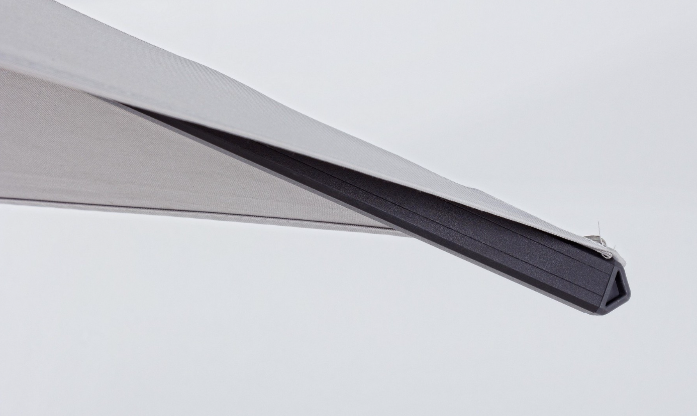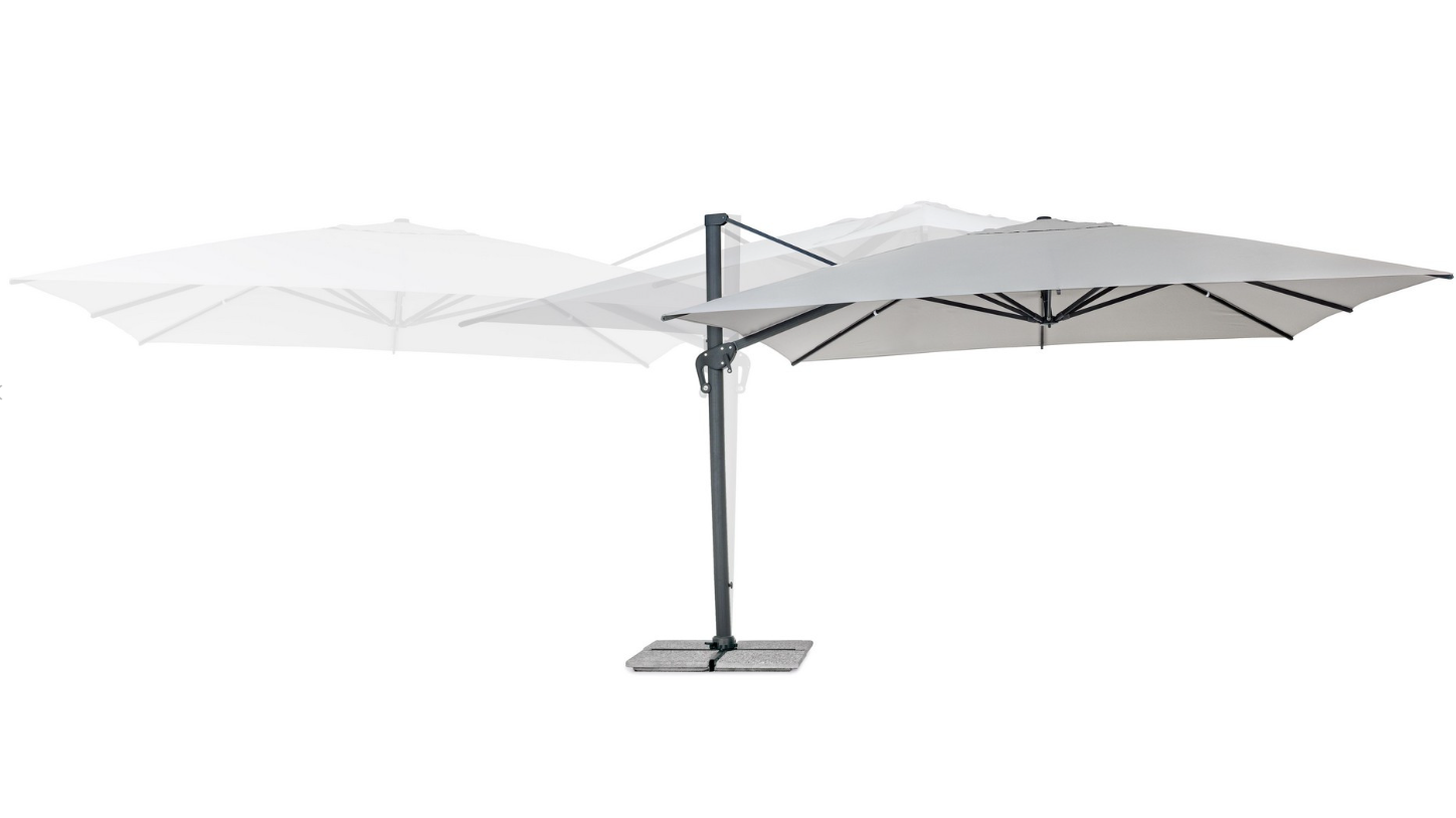 Czasza o powierzchni aż 16 m² wykonana jest z wytrzymałego poliestru o gramaturze 250 g/m², wzmocnionego powłoką poliamidową (PA). Zapewnia to skuteczną ochronę przed słońcem dla dużej grupy gości. Parasol wyposażono w zaawansowane systemy regulacji, które czynią jego obsługę niezwykle prostą: mechanizm obrotu o 360° sterowany pedałem oraz uchwyt do 5-stopniowej regulacji nachylenia czaszy w pionie. Otwór wentylacyjny w szczycie parasola wspomaga cyrkulację powietrza w upalne dni.