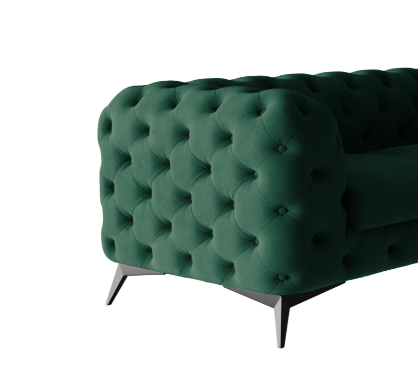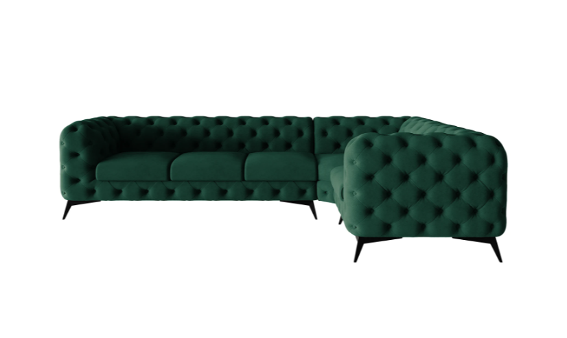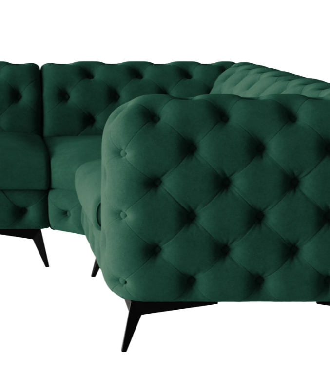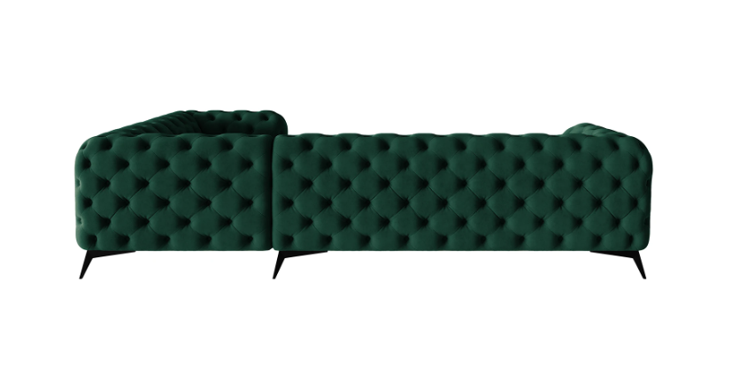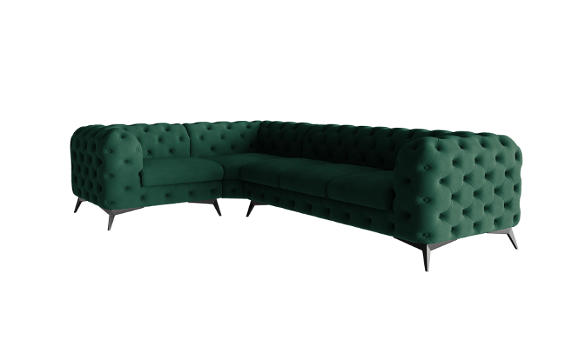 Wyjątkowy pikowany narożnik Chesterfield Chloe w eleganckim odcieniu butelkowej zieleni. Jego modna stylistyka i charakterystyczne pikowania dodają mu niepowtarzalnego uroku.