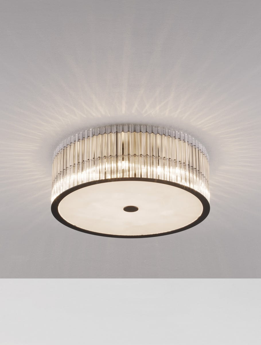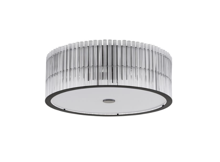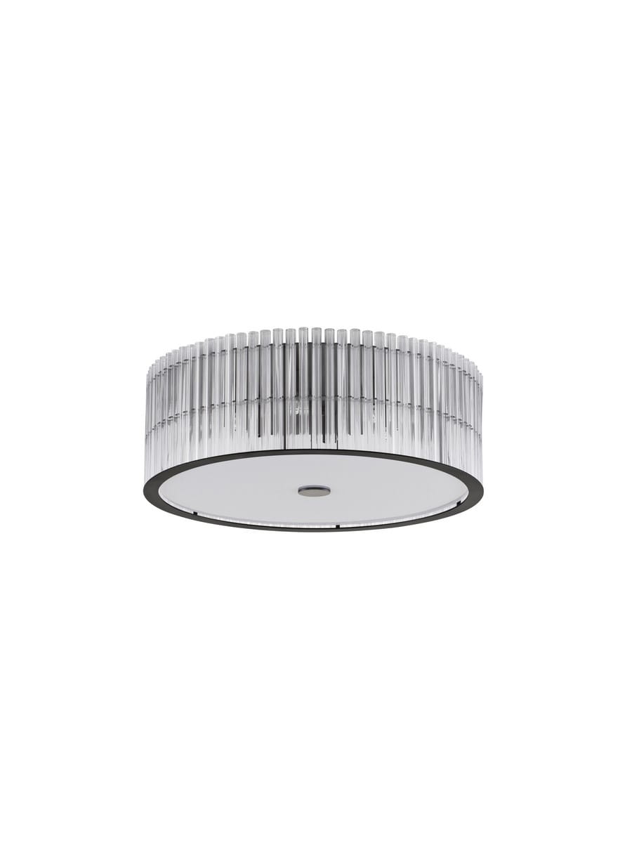 Klosz tworzy pojedynczy ring pokryte podłużnymi, kryształowymi płytkami, wykonanymi z transparentnego szkła. Kryształki osadzone są na czarnej, metalowej konstrukcji dodającej całości nowoczesnego charakteru. Od dołu lampa wykończona została białą osłonką, subtelnie tłumiącą światło.
