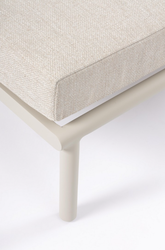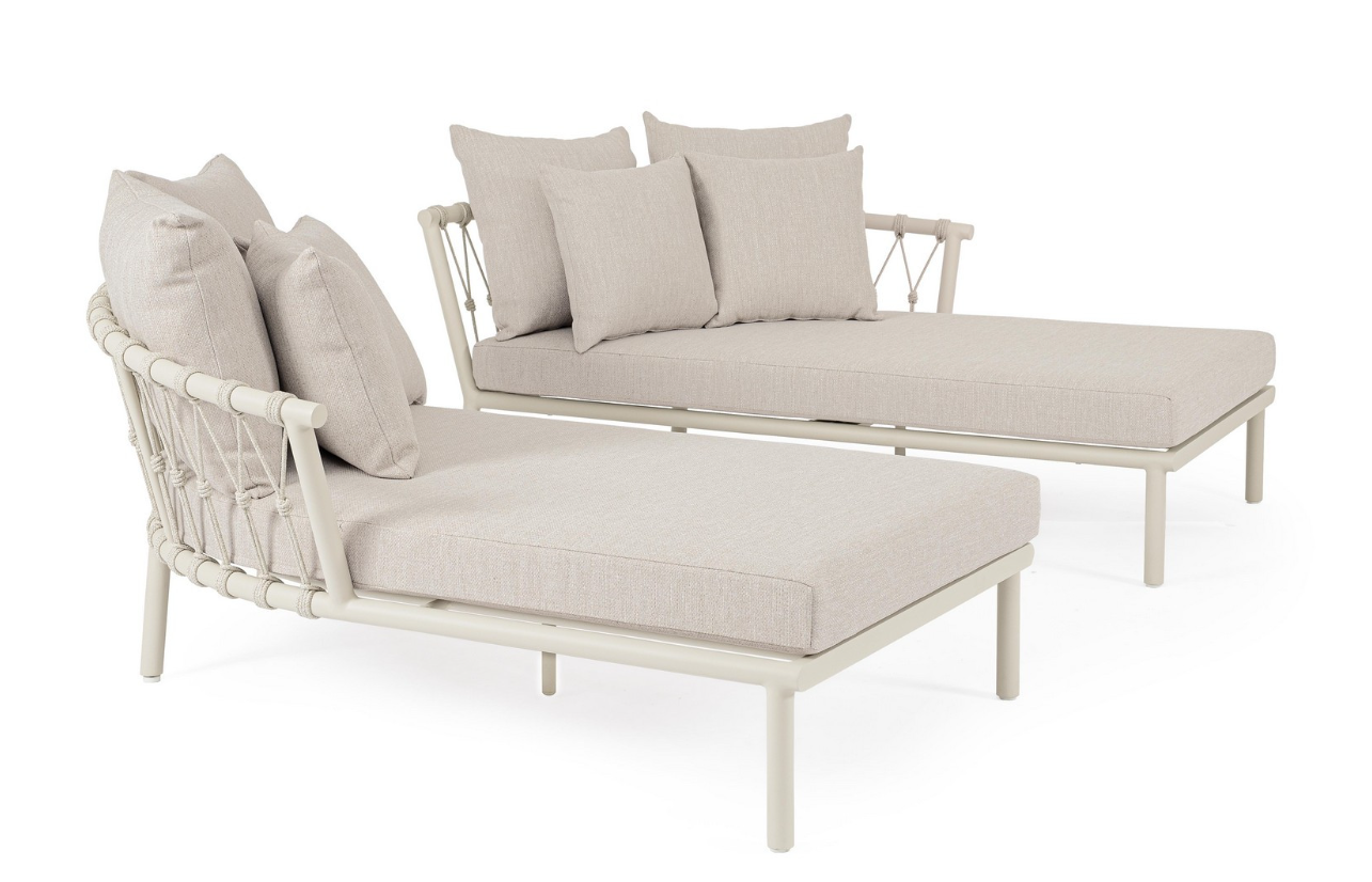 Podwójne łóżko ogrodowe Lanai z prestiżowej linii Bizzotto Homemotion to mistrzowskie połączenie elastyczności i wyrafinowanego wzornictwa. Zestaw składa się z dwóch niezależnych modułów, które zestawione razem tworzą imponującą, szeroką na ponad 2 metry przestrzeń do wspólnego relaksu. Konstrukcję każdego z elementów oparto na solidnej, lecz wizualnie lekkiej ramie z aluminium malowanego proszkowo w piaskowym odcieniu, co gwarantuje całkowitą odporność mebli na korozję.