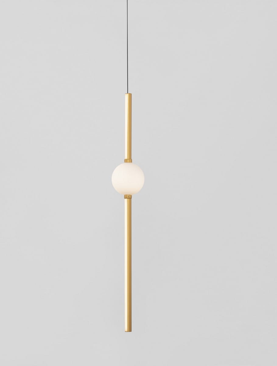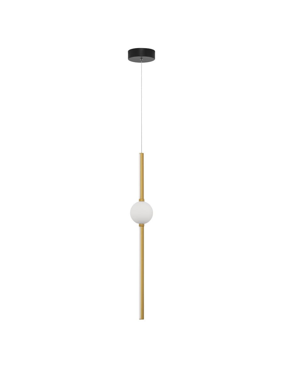 Lampa składa się z pionowo wiszącego klosza, mającego formę podłużnej złotej rury, na której umieszczona została ozdobna kula. Kula ma biały, mleczny odcień co pięknie komponuje się ze złotą oprawą. Źródło światła LED wbudowane zostało wzdłuż całej długości klosza, dając światło o naturalnej barwie z możliwością ściemniania za pomocą zewnętrznego ściemniacza.