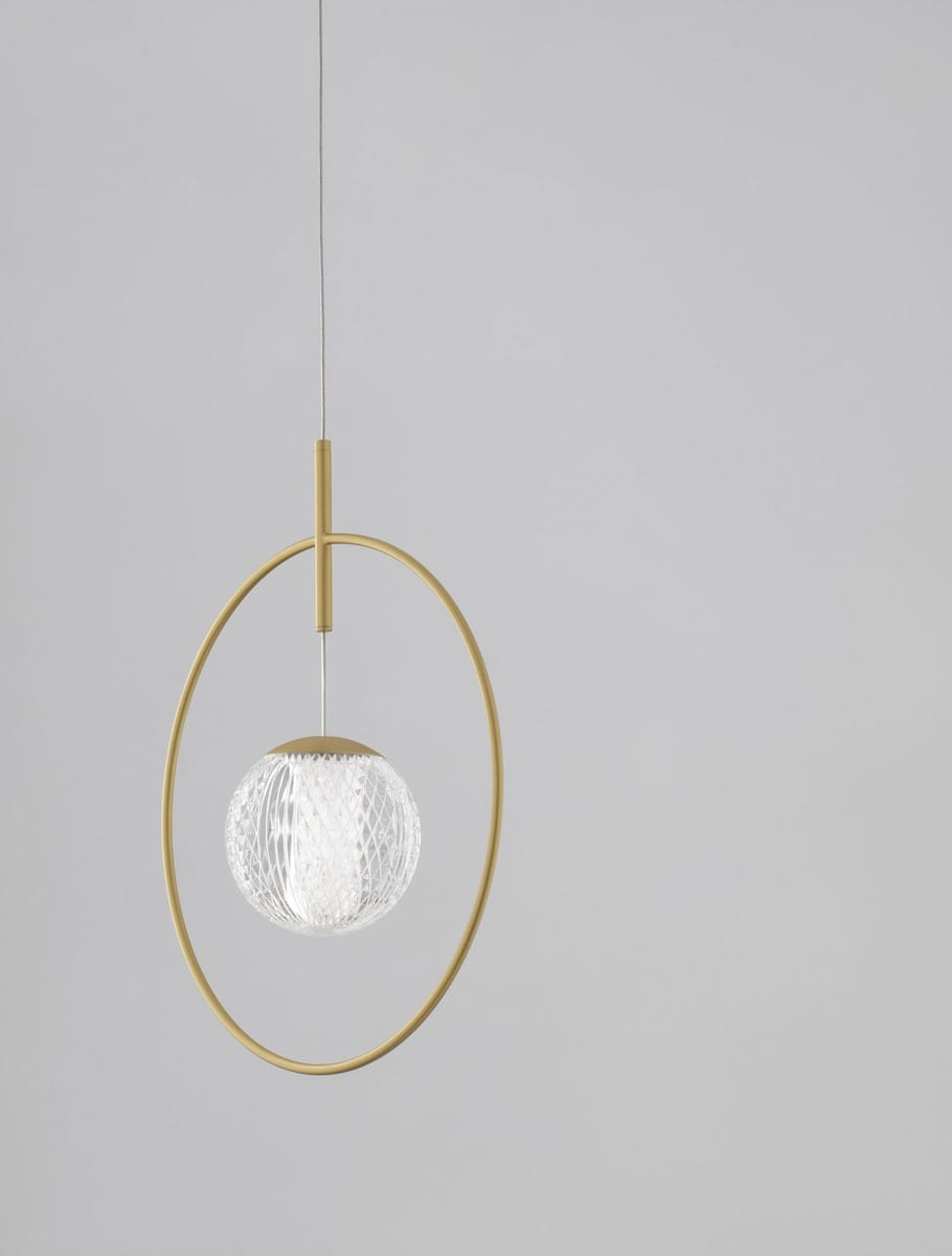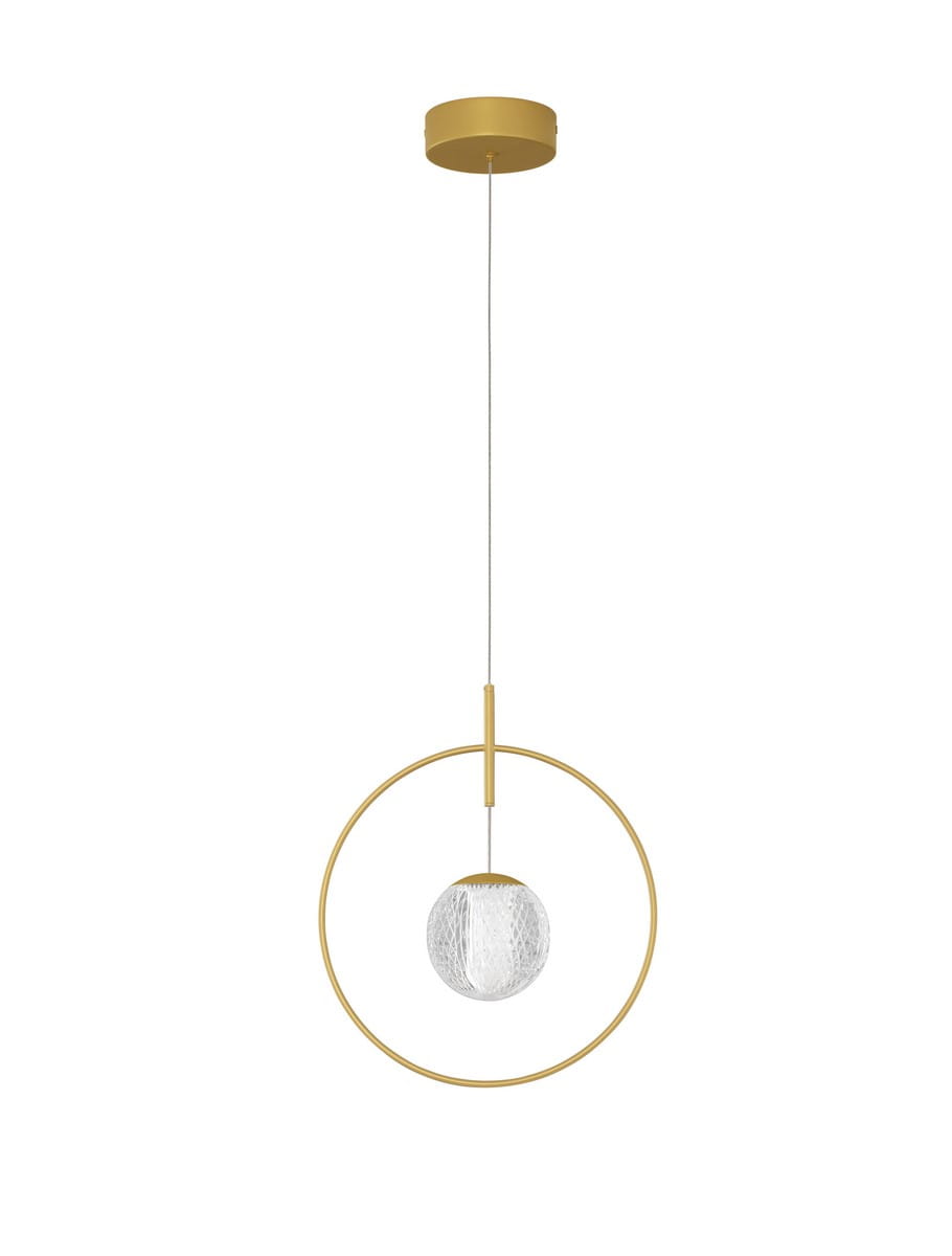 Lampa wisząca Bacata to kompozycja, która składa się z minimalistycznego ringu, otaczającego transparentną kulę wykonaną z trwałego akrylu. Jej powierzchnię pokrywa ozdobny wzór z kryształków, tworząc magiczny efekt rozproszonego światła. Oprawę wykonano z aluminium w złotym kolorze, które łączy w sobie lekkość i wytrzymałość.