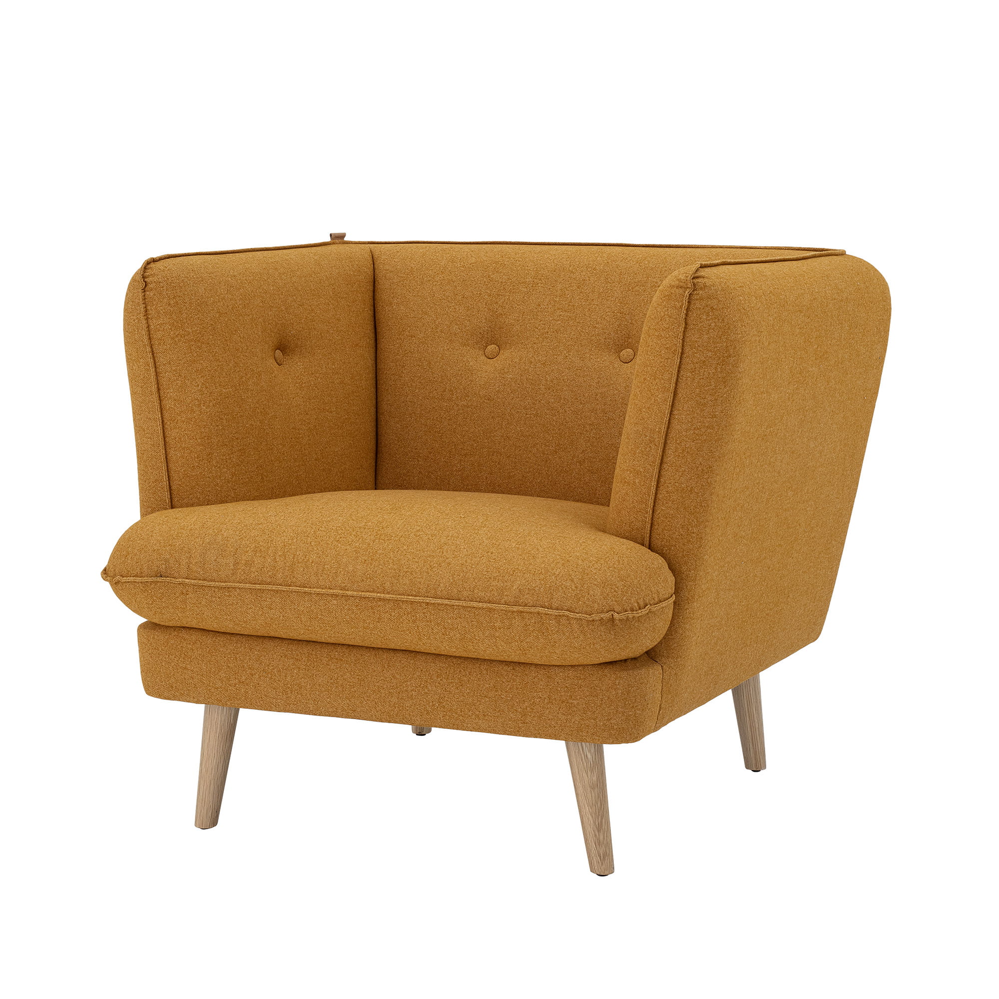 Pomarańczowy fotel duńskiej marki Bloomingville. Fotel sprawa wrażenie obudowanego poduchami. Dzięki wygodnemu oparciu i podłokietnikom na tym samym poziomie, fotel zapewni 100% komfortu i relaksu. Uroku dodają guziki, które są częścią centralną oparć. Całość osadzona na czterech drewnianych nóżkach.