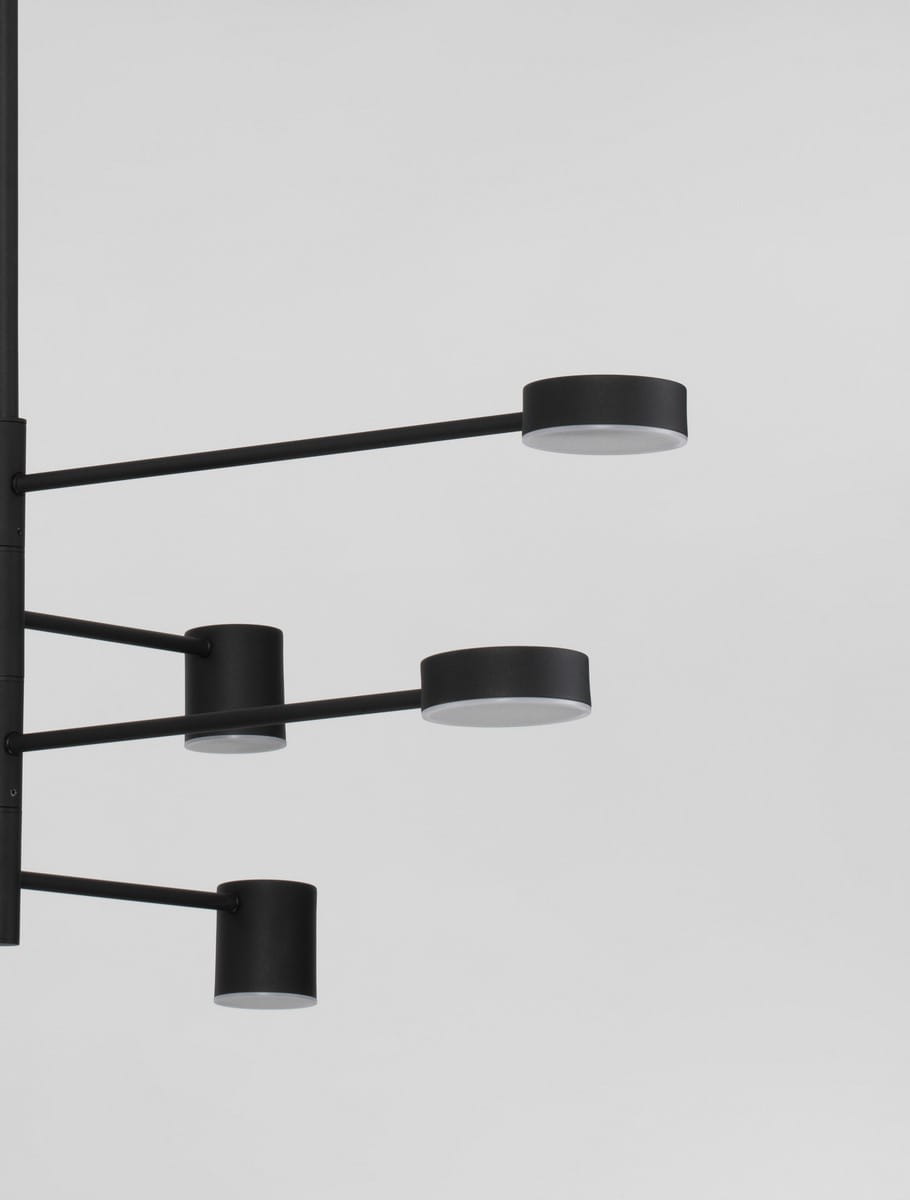 Lampa wisząca Abel-8 w całości wykonana została z aluminium w czarnym kolorze o matowym wykończeniu. Okrągła podsufitka utrzymuje pionowy, metalowy pręt z ośmioma rozgałęzieniami w postaci metalowych rurek. Każda z ośmiu rurek zakończona jest okrągłym kloszem, skrywającym źródło światła LED. Naprzemienne rozmieszczenie kloszy o różnych rozmiarach i średnicach daje ciekawy efekt asymetrii oraz pozwala na uzyskanie dekoracyjnych efektów świetlnych. Klosze wykończone zostały za pomocą akrylu o wysokiej trwałości. Lampa posiada możliwość ściemniania, za pomocą zewnętrznego ściemniacza.