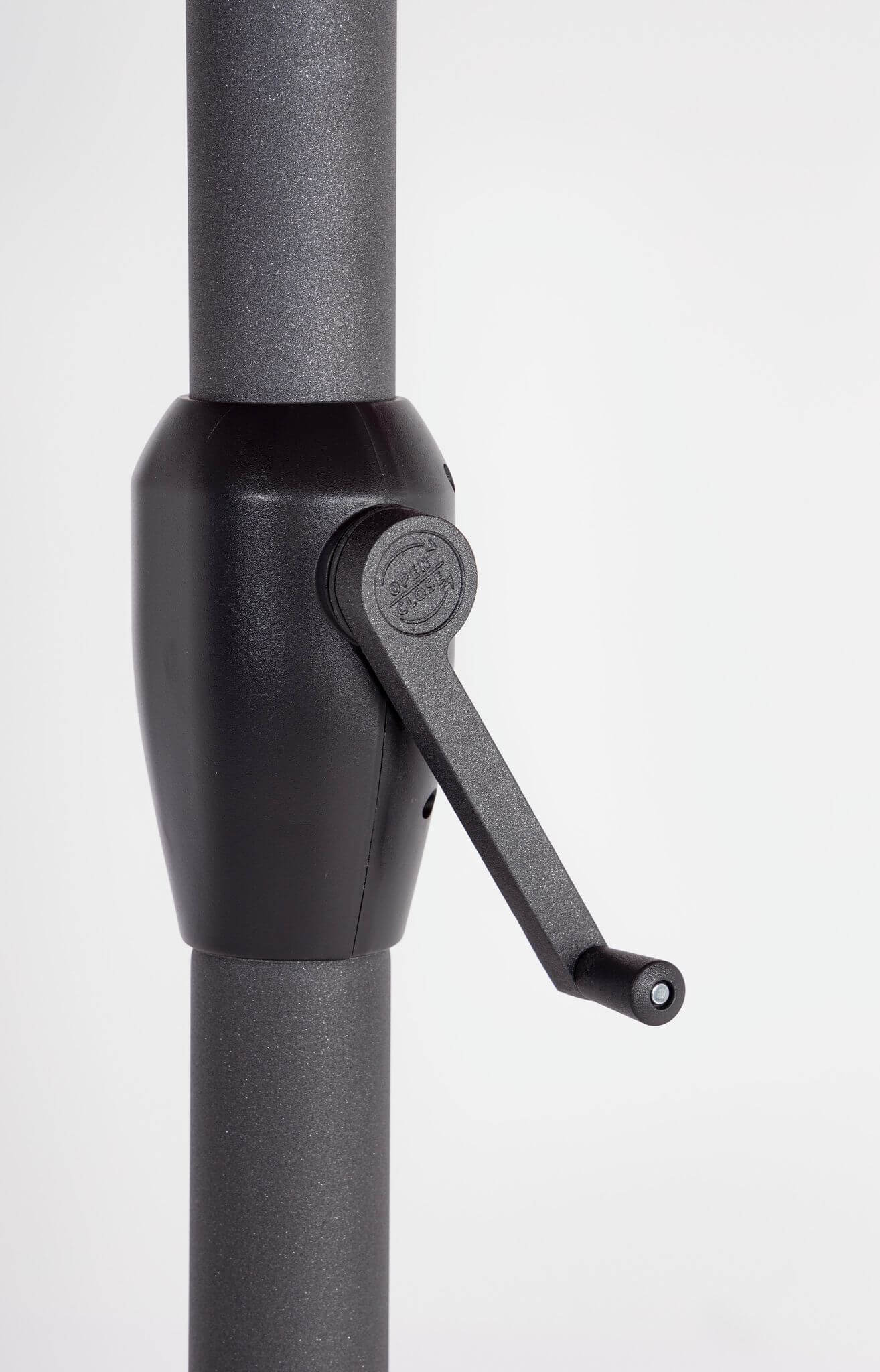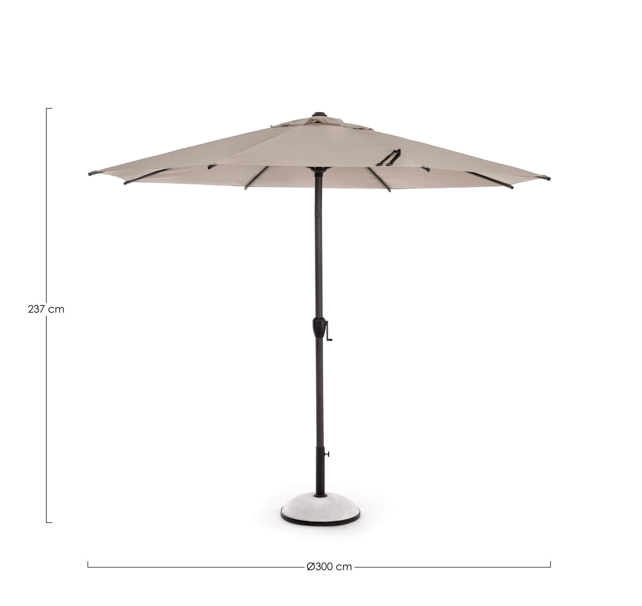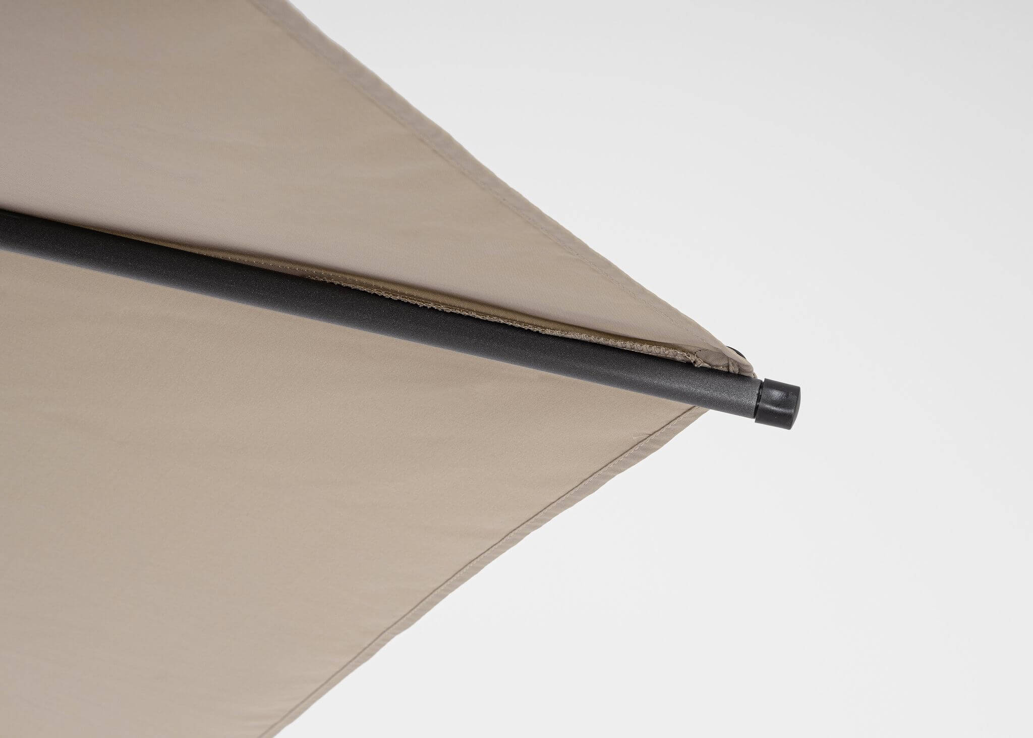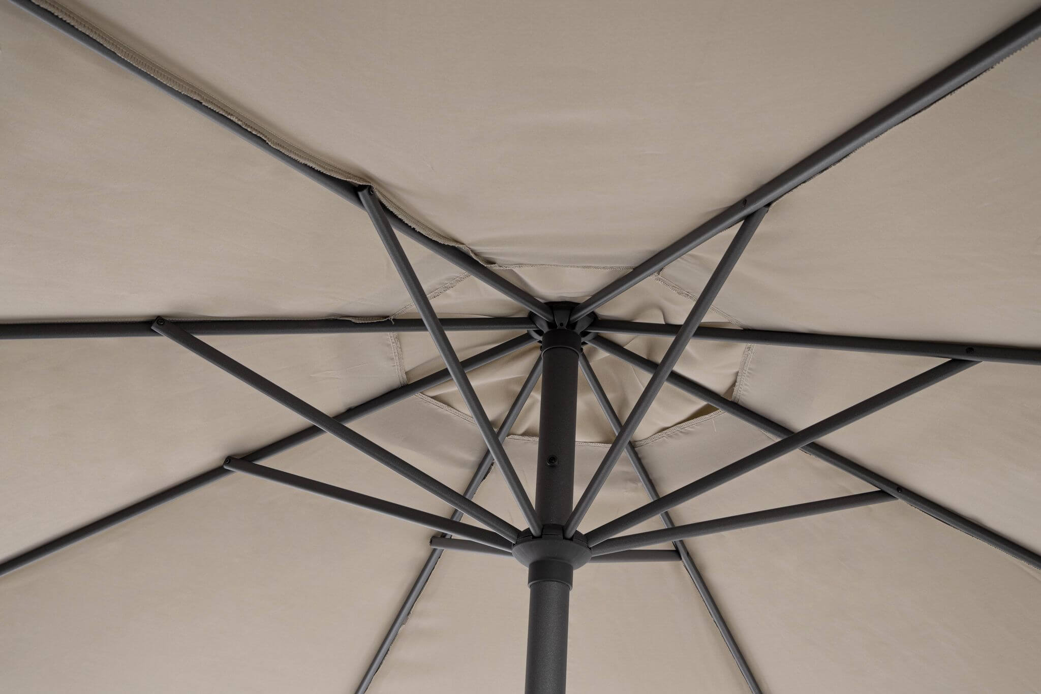 Parasol ogrodowy składa się z aluminiowego słupka głównego, ośmiu stalowych żeber fosforanowanych oraz poliestrowego poszycia (180 g/m²) z otworem wentylacyjnym.