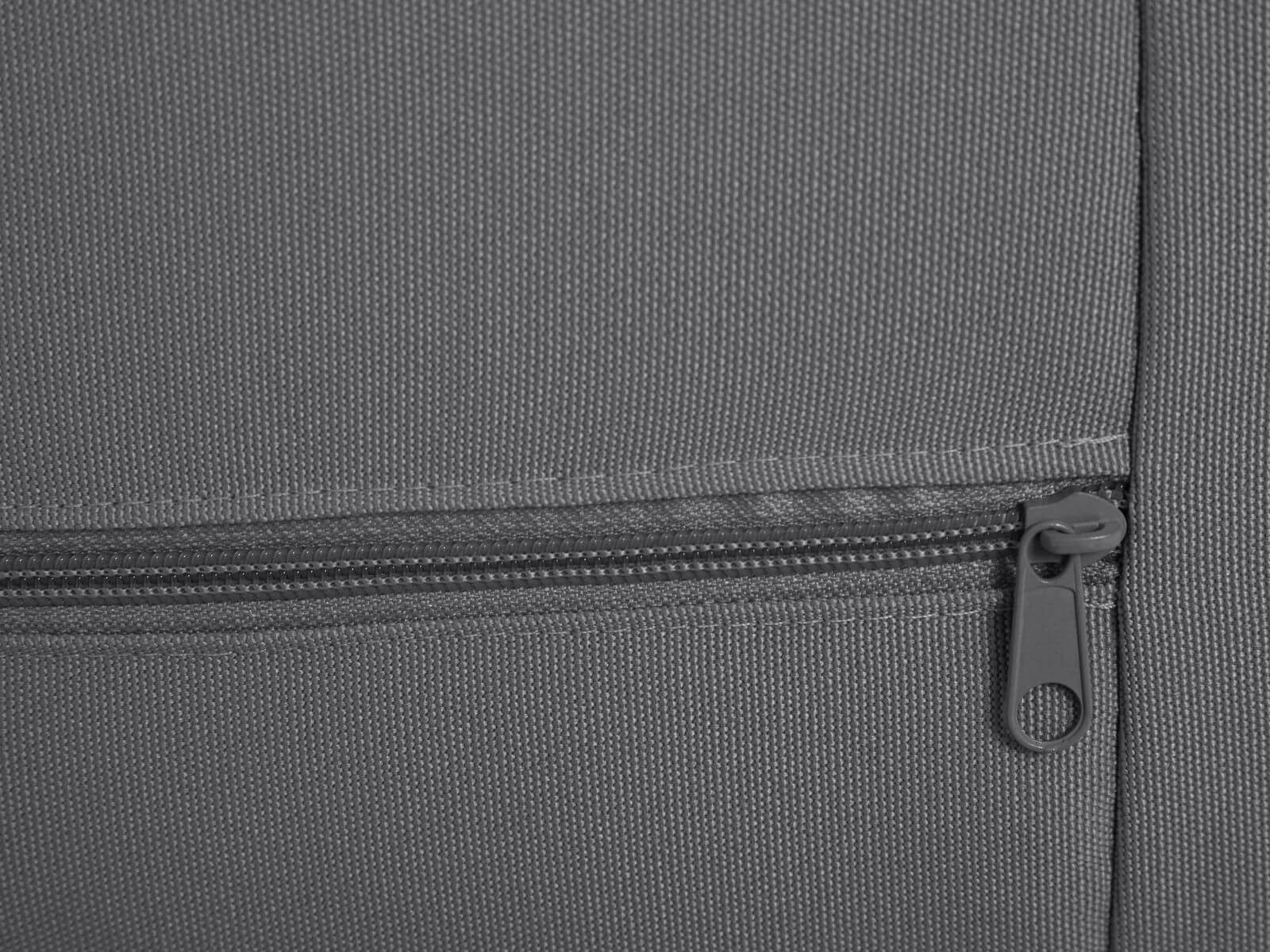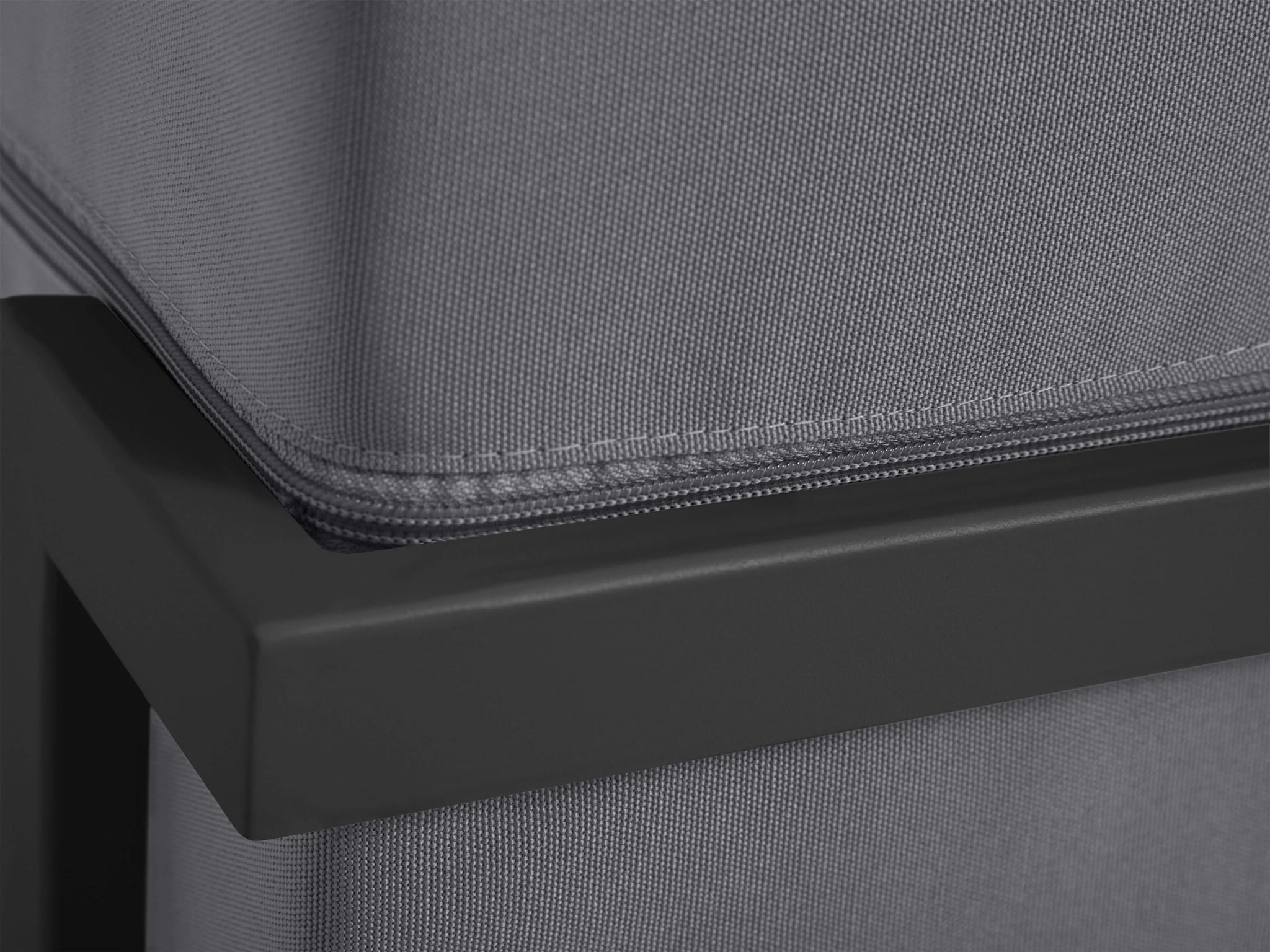 Pufa pokryta jest ciemno szarą tkaniną Toptextil Garden, przeznaczoną głównie do mebli ogrodowych, tarasowych i balkonowych. Jej gładka struktura, o prostym, płóciennym splocie ma lekko połyskującą powierzchnię. Przyjemna w dotyku. Charakteryzuje się wysoką odpornością na nasłonecznienie.