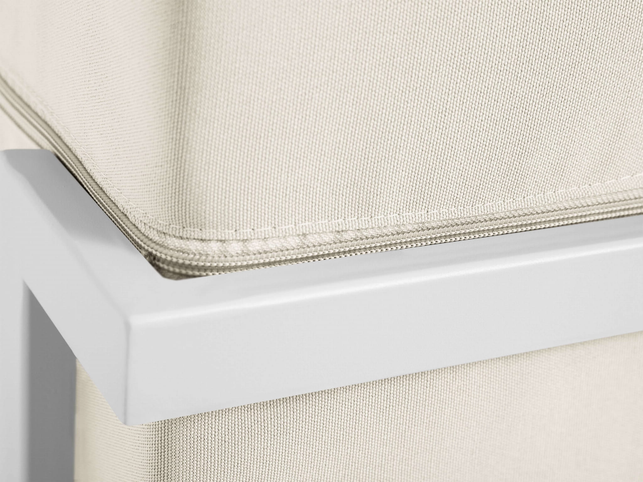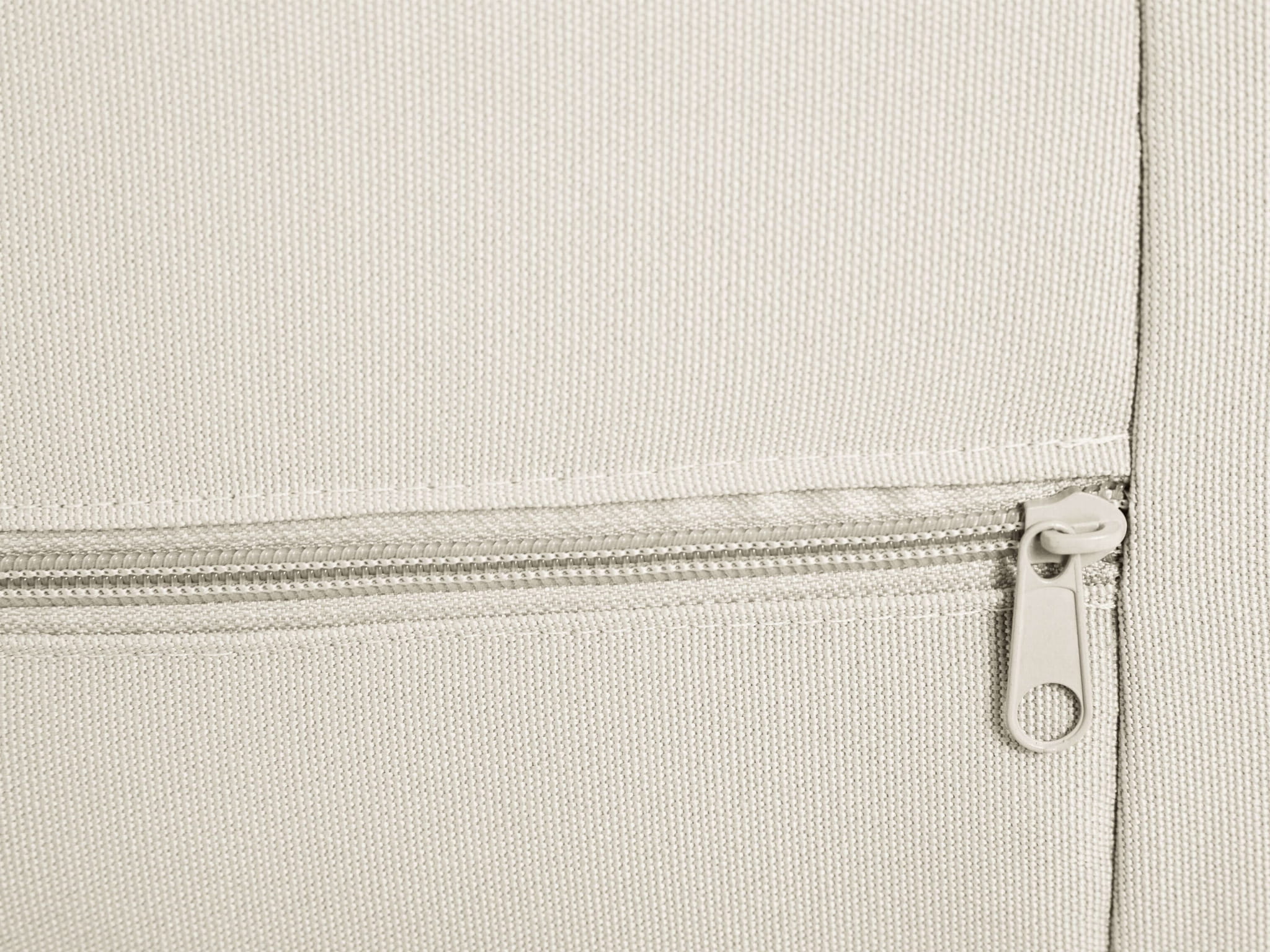 Pufa pokryta jest beżową tkaniną Toptextil Garden, przeznaczoną głównie do mebli ogrodowych, tarasowych i balkonowych. Jej gładka struktura, o prostym, płóciennym splocie ma lekko połyskującą powierzchnię. Przyjemna w dotyku. Charakteryzuje się wysoką odpornością na nasłonecznienie.