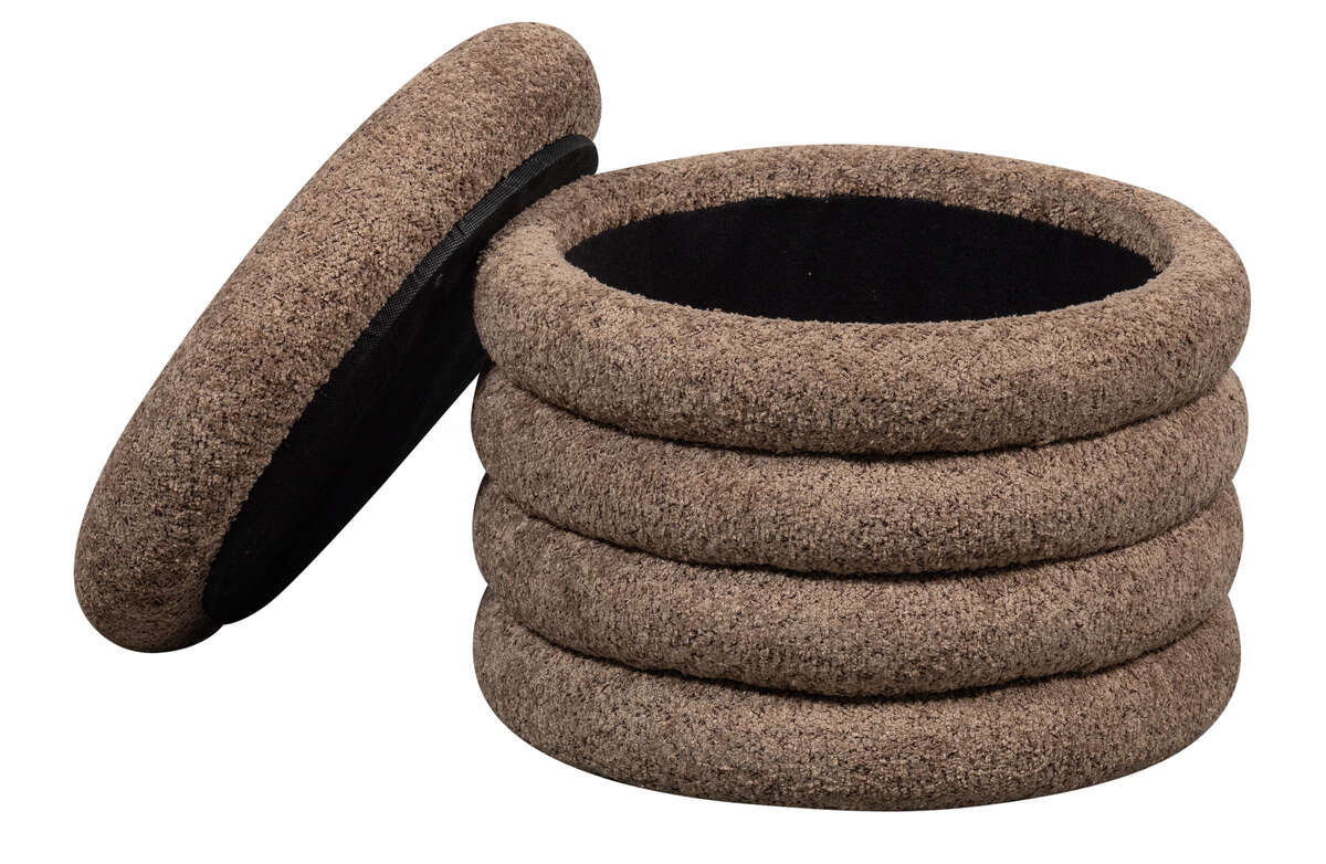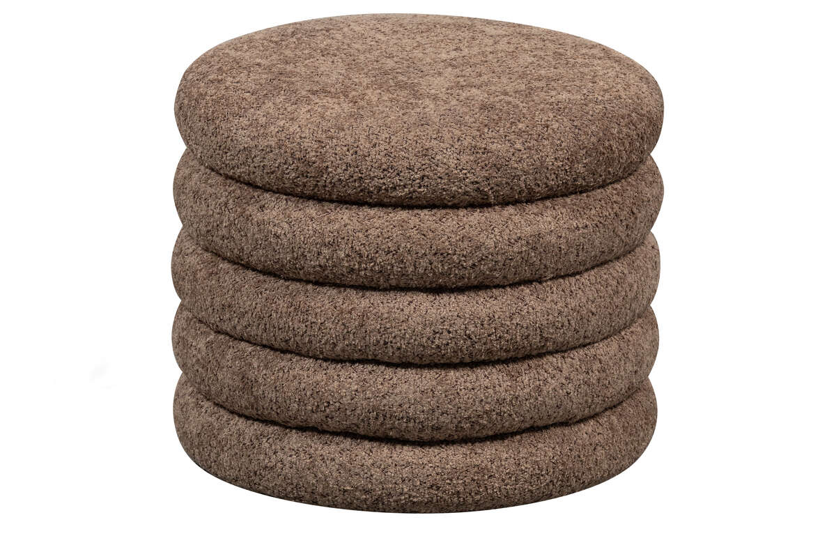 Pufa Kimi z kolekcji Exclusive holenderskiej marki WOOOD to ułożone w stos pierścienie, otulone miękką, pluszową tkaniną w brązowym kolorze. Jej nietypowy, organiczny kształt nawiązuje do natury, czerpiąc inspirację z miękkich linii i swobodnych zaokrągleń występujących w przyrodzie.