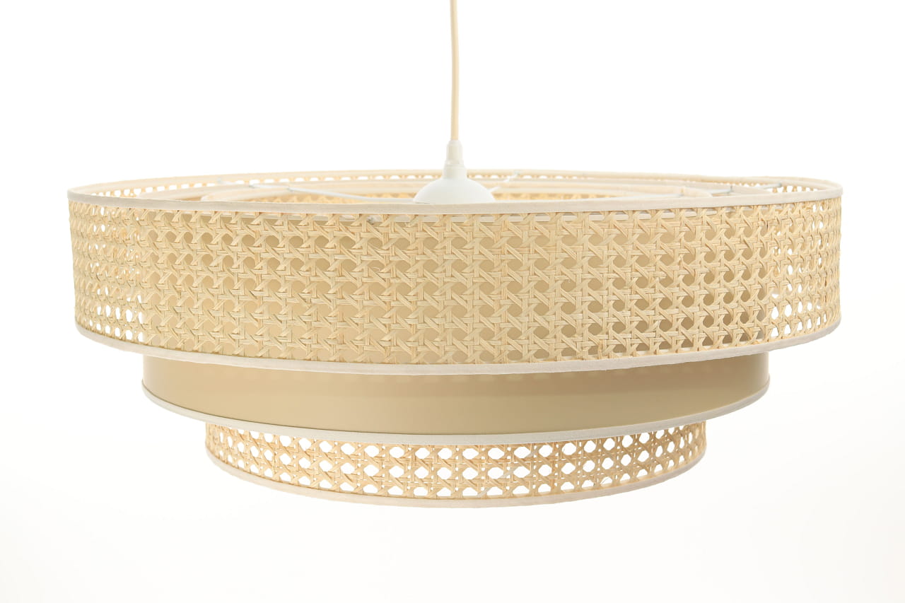 Lampa została wykonana z wysokiej jakości naturalnych włókien palmy rotangowej, dzięki czemu jest trwała i mocno inspirowana naturą. Wyjątkowości dodaje jej środkowy pierścień w kolorze beżowym. Całość utrzymuje biała, metalowa podsufitka, do której przymocowany został kremowy przewód o długości 80 cm. Lampa rattanowa prezentuje się niesamowicie zarówno przy zgaszonym, jak i zapalonym świetle.