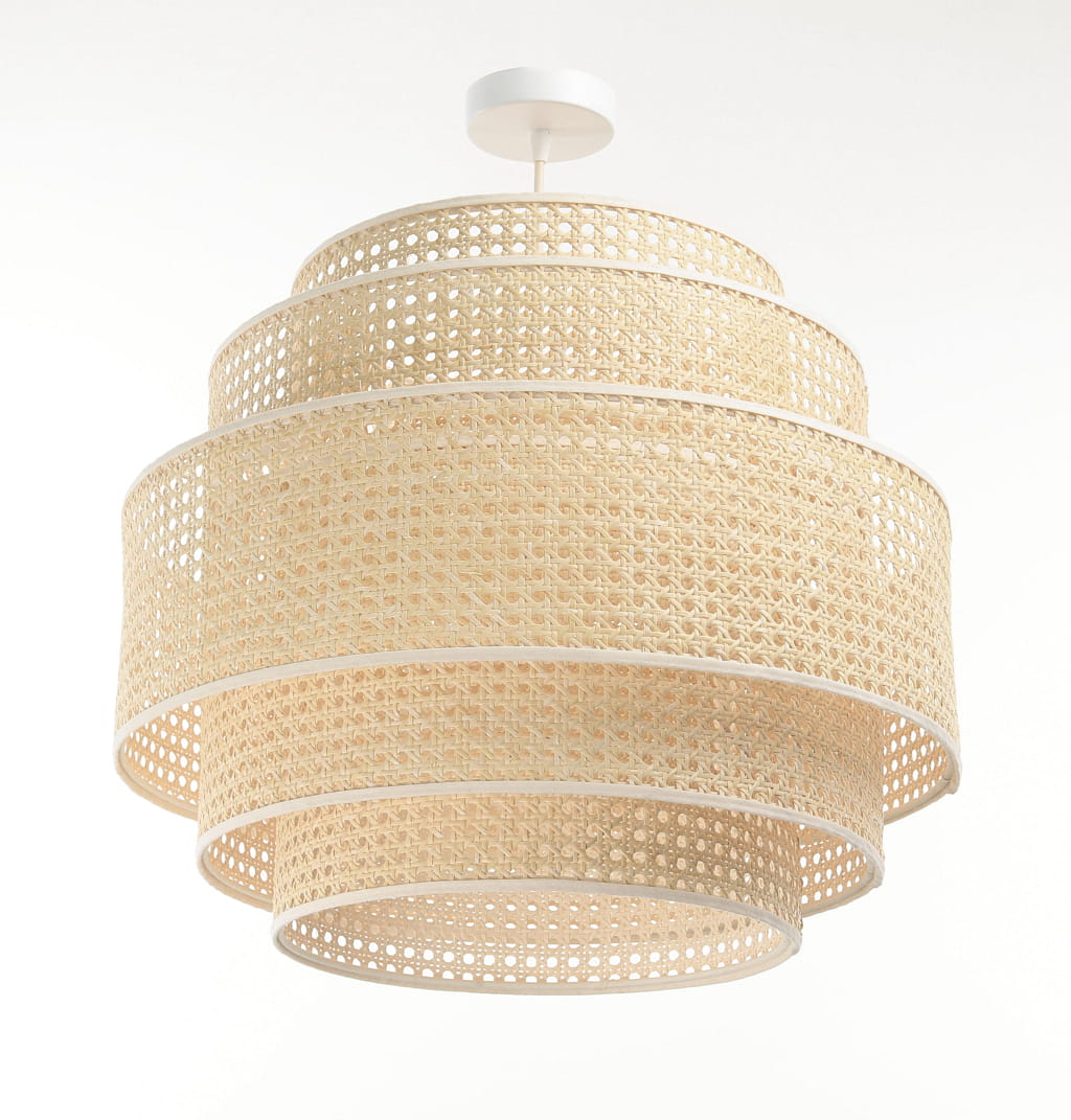 Lampa została wykonana z wysokiej jakości naturalnych włókien palmy rotangowej, dzięki czemu jest trwała i mocno inspirowana naturą. Wyjątkowości dodają jej trzy pierścienie z rattanu połączone ze sobą w piękny kształt. Całość utrzymuje biała, metalowa podsufitka, do której przymocowany został kremowy przewód o długości 80 cm. Lampa rattanowa prezentuje się niesamowicie zarówno przy zgaszonym, jak i zapalonym świetle.