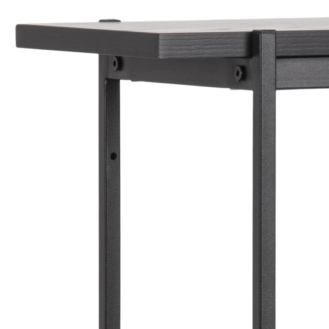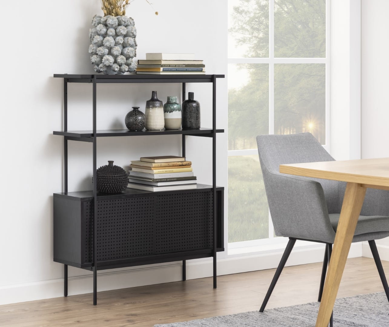 Czarne półki zostały wykonane z płyty MDF i wykończone okleina imitująca drewno jesionu. Z kolei stelaż wykonany jest z metalu i malowany metodą proszkową. Ciekawym i zarazem praktycznym rozwiązaniem jest szafka z przesuwanymi frontami. Ażurowe fronty pomogą ukryć przedmioty, których nie chcemy trzymać na wierzchu. Pomimo prostej konstrukcji, mebel jest niezwykle praktyczny i wygląda czarująco. Regał bez wątpienia wniesie do wnętrza nutę dobrego stylu i nada mu charakteru.