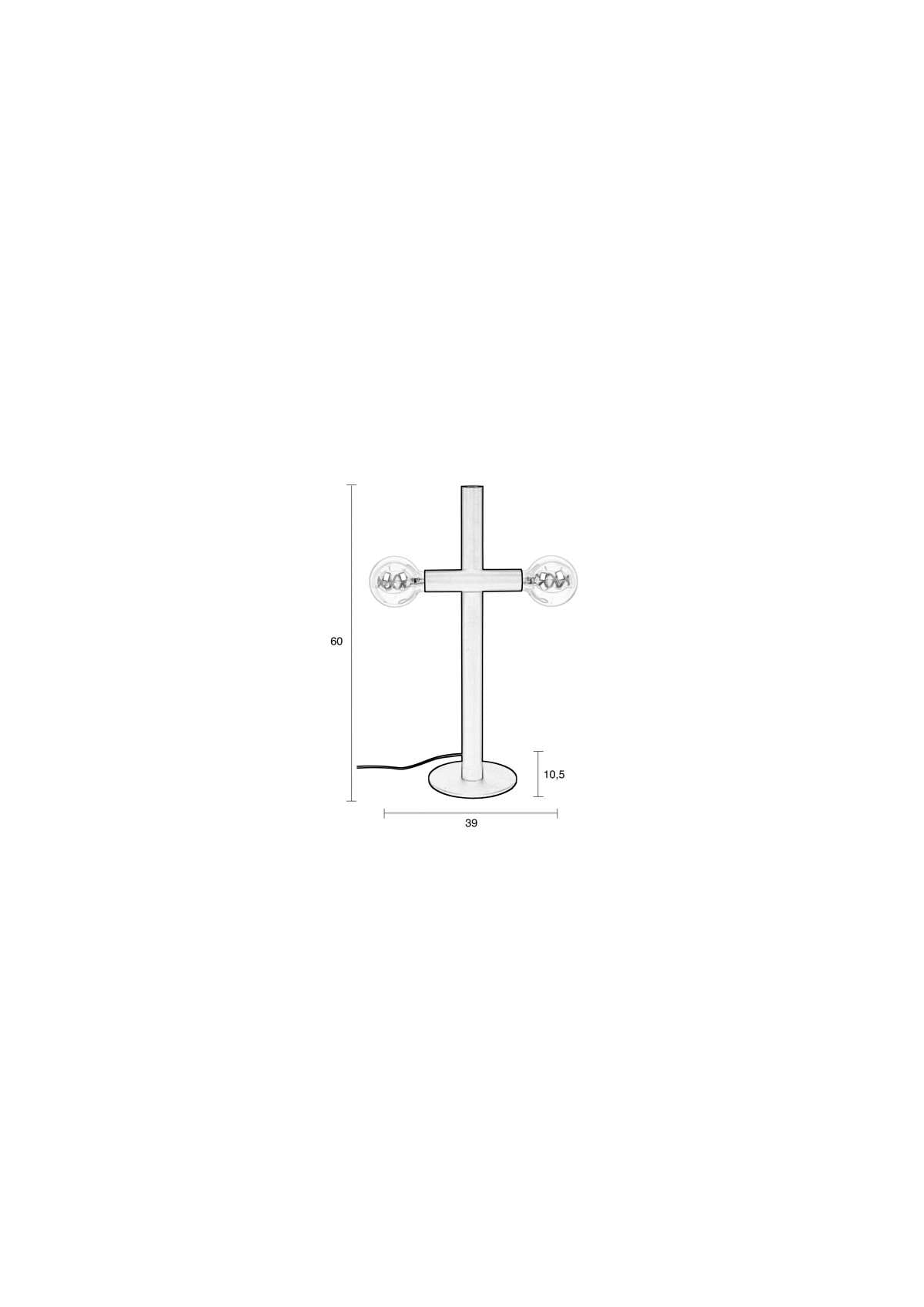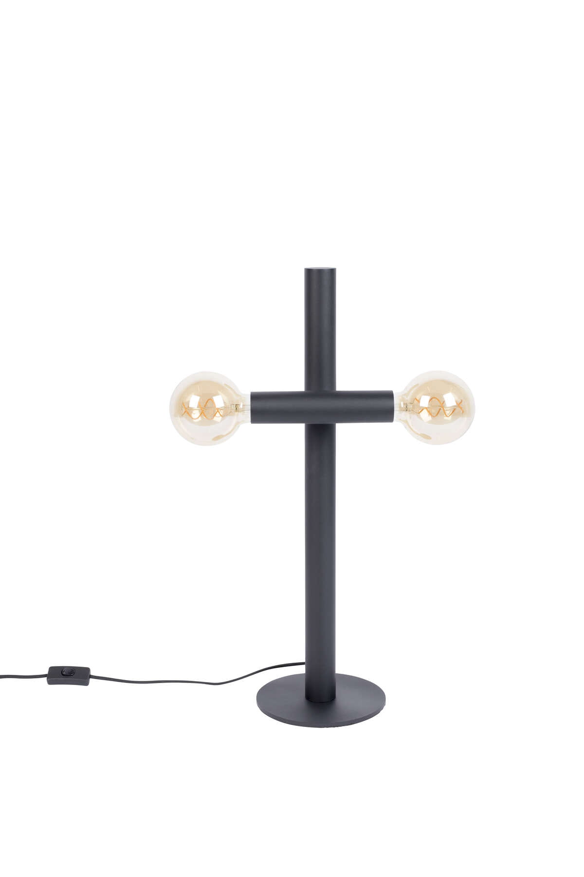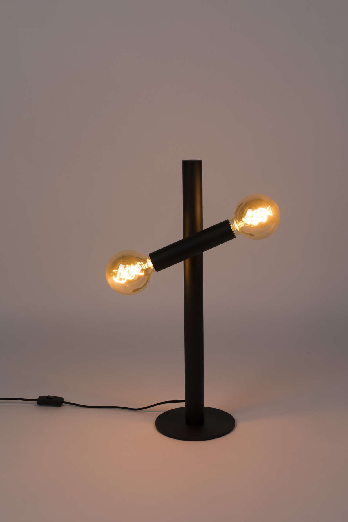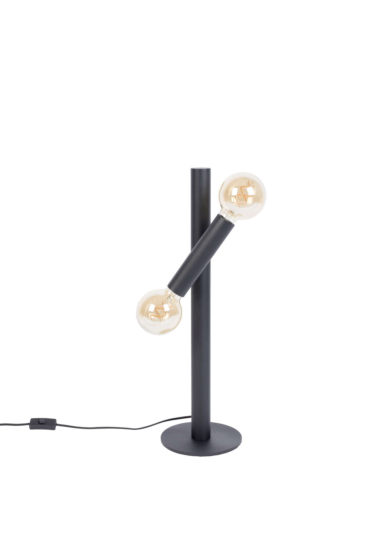 Na głównym korpusie osadzone jest krótsze ramię, zwieńczone z obu stron odkrytymi żarówkami. Zastosowanie dekoracyjnych żarówek typu Edison podkreśli design lampy i nada klimatu w stylu vintage. Niezwykle praktyczną funkcją jest regulowane ramię, które można dowolnie przesuwać, zmieniając jego kąt nachylenia. Lampa osadzona jest na okrągłej podstawie, z której wychodzi teksturowany kabel z włącznikiem światła.