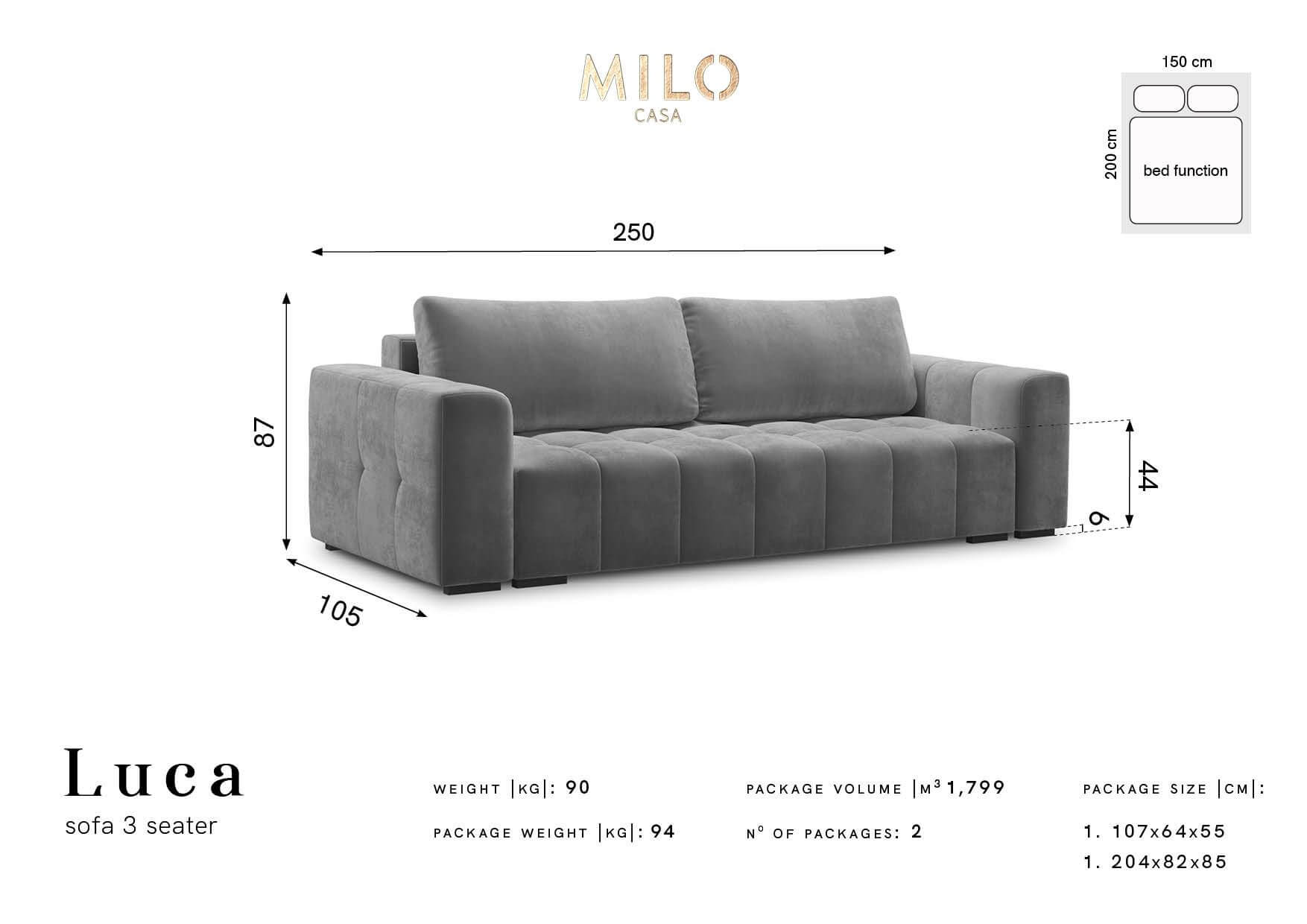 Sofa Luca z funkcją spania ma trzy obszerne siedziska, a po rozłożeniu zamienia się w wygodne łóżko o wymiarze 150x200 cm. Mebel zawiera także pojemny schowek na pościel.