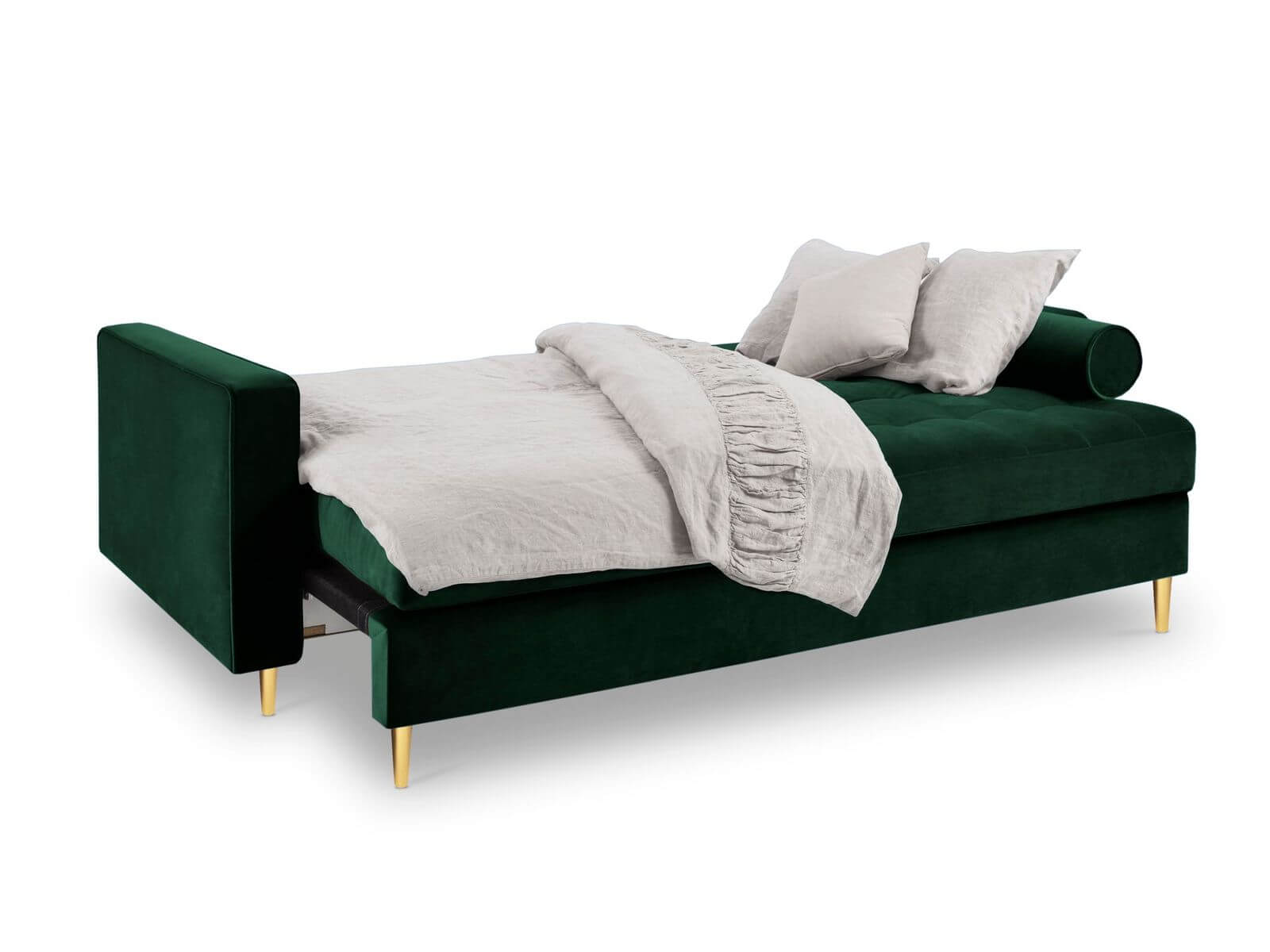Ponadczasowe pikowanie oraz nóżki w złotym kolorze nadają sofie eleganckiego, królewskiego wyglądu, który z powodzeniem urozmaici wnętrza w stylu art deco czy urban jungle. Rozkładana sofa w kolorze butelkowej zieleni świetnie zaprezentuje się w domowym salonie, ale także będzie dobrym rozwiązaniem do hotelowego pokoju. Goście z pewnością będą zachwyceni.