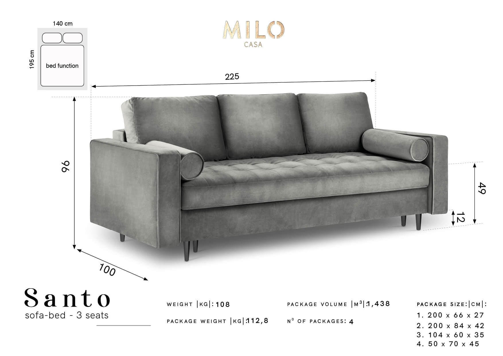 Kolor trzyosobowej, rozkładanej sofy Santo to czarny - Salvador 19 (tkanina) oraz czarny (nóżki). Mebel oferujemy także na złotych nogach i w innych kolorach.