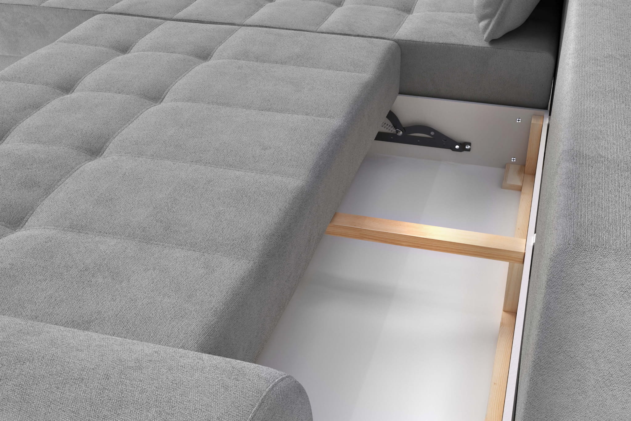 Drewno, jako naturalny materiał, dodaje szarej sofie przytulnego charakteru, który kojarzy się z ciepłem domowego ogniska. Drewniane nóżki szarego narożnika mają aż 16 cm wysokości, co niesie za sobą zarówno walory estetyczne, jak i praktyczne. Luka pomiędzy podłogą a meblem, sprawia iż sofa narożna nabiera lekkości, otwiera się na przestrzeń, z gracją współgra z otoczeniem. Jest to także udogodnienie, pozwalające na łatwe utrzymanie czystości pod meblem.