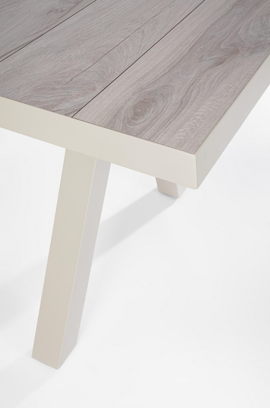 Stół ogrodowy Krion w subtelnym, piaskowym odcieniu to niezwykle uniwersalna propozycja, która świetnie sprawdzi się na nieco mniejszych tarasach i patiach, nie rezygnując przy tym z luksusowego wyglądu. Jego mocna podstawa o wyrazistym, ukośnym profilu nóg została wykonana z aluminium malowanego proszkowo i zmontowana z użyciem nierdzewnych śrub. Taka konstrukcja zapewnia doskonałą stabilność oraz całkowitą odporność na niekorzystne warunki atmosferyczne.