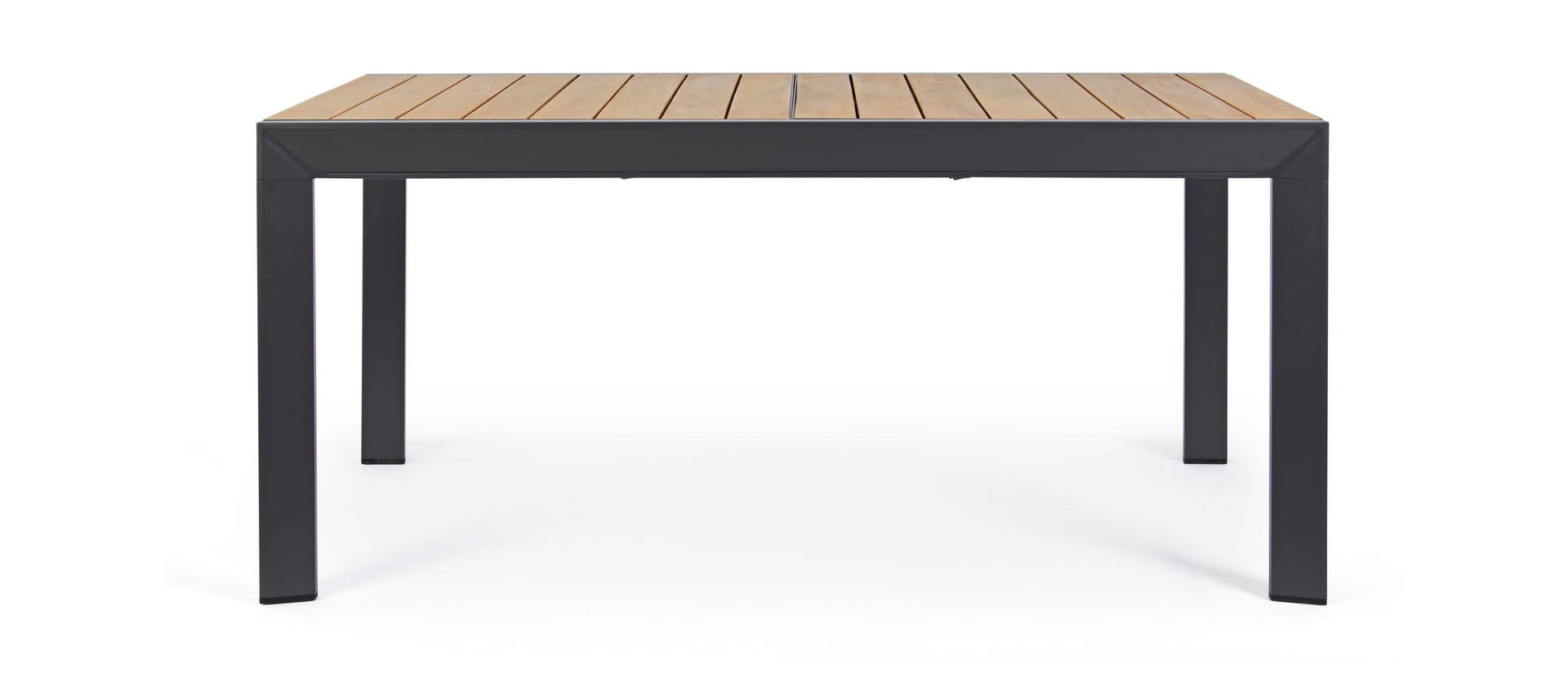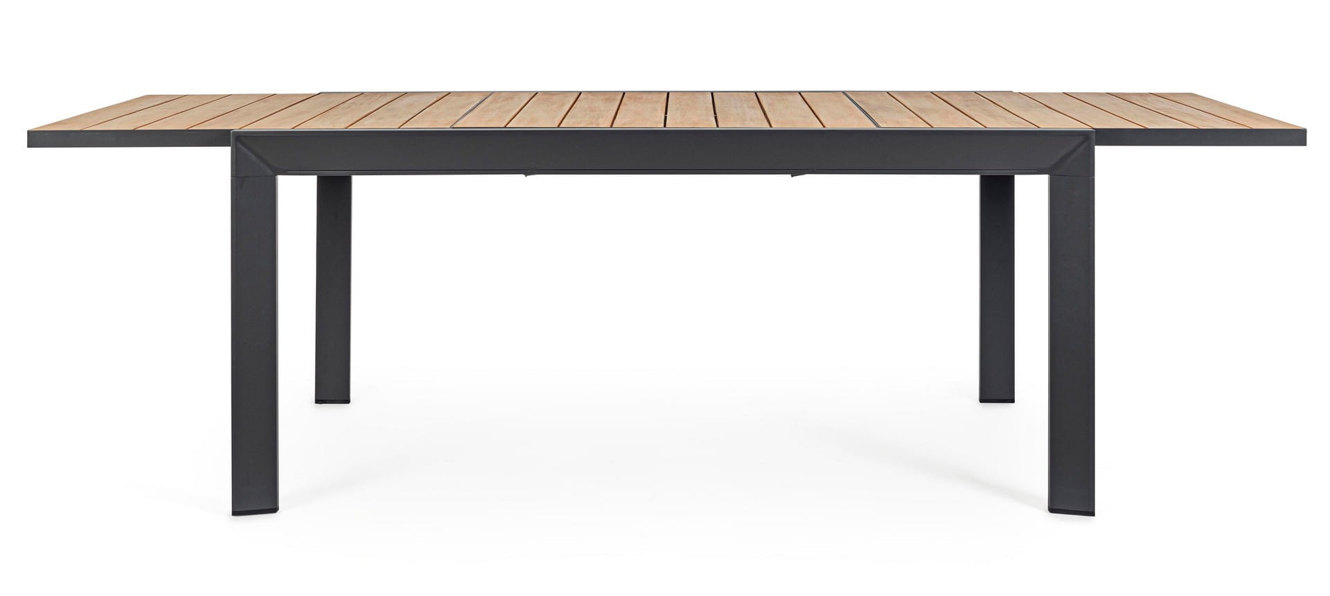 Blat z listwami pokrytymi farbą imitującą drewno nadaje meblowi naturalny charakter i elegancję, jednocześnie ułatwiając utrzymanie w czystości. Model Belmar wyposażono w praktyczny mechanizm rozkładania, który umożliwia łatwe powiększenie powierzchni stołu w razie potrzeby, a regulowane stopki gwarantują stabilność nawet na nierównej nawierzchni.