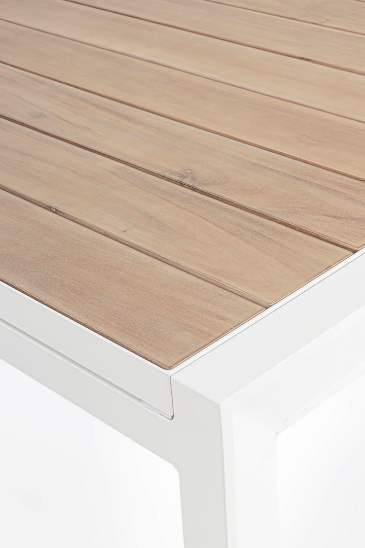 Blat z listwami pokrytymi farbą imitującą drewno nadaje meblowi naturalny charakter i elegancję, jednocześnie ułatwiając utrzymanie w czystości. Model Belmar wyposażono w praktyczny mechanizm rozkładania, który umożliwia łatwe powiększenie powierzchni stołu w razie potrzeby, a regulowane stopki gwarantują stabilność nawet na nierównej nawierzchni.