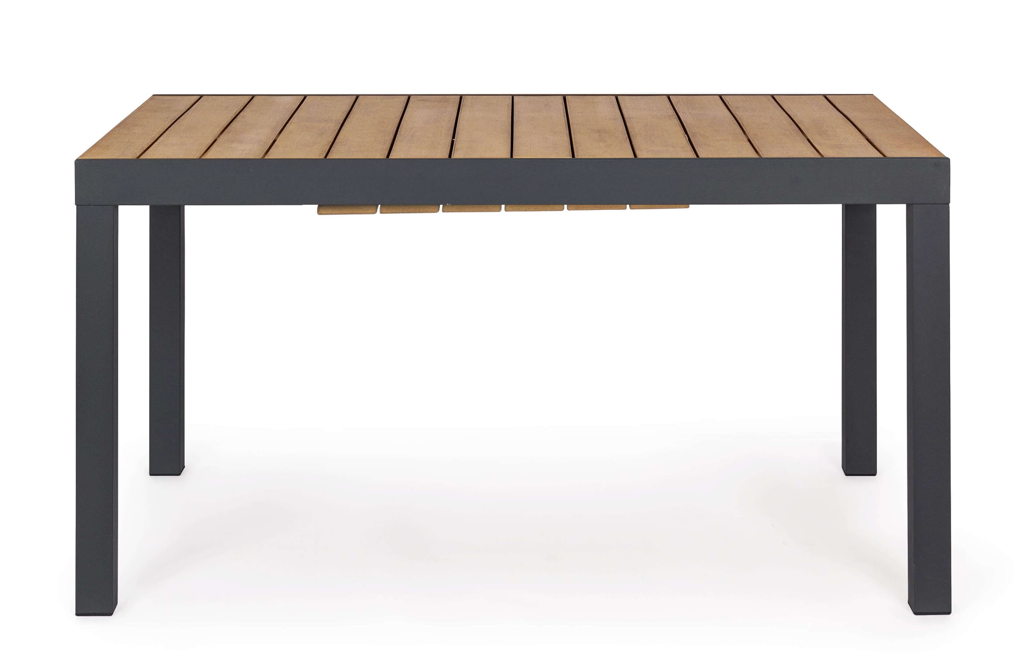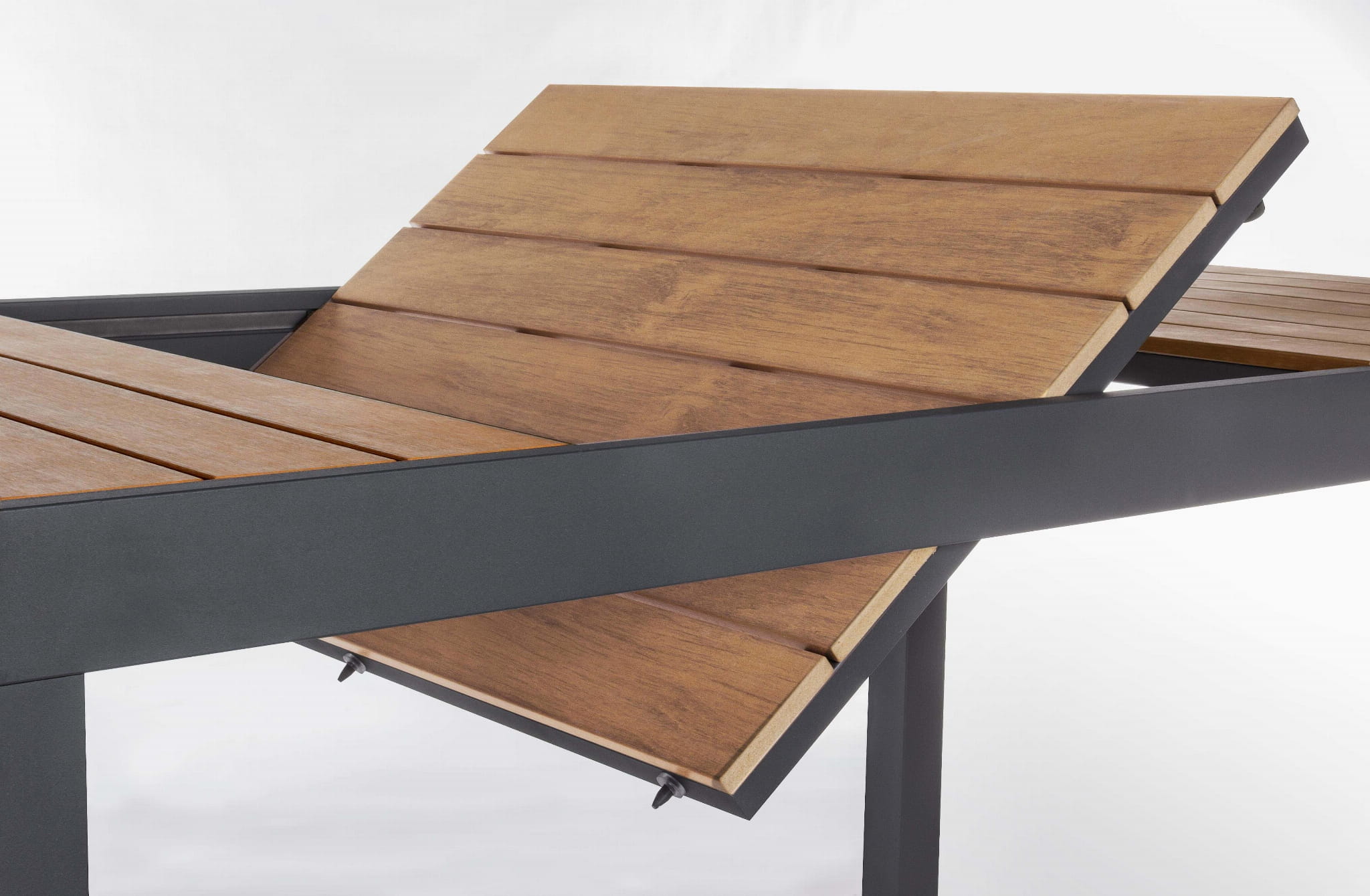 Wykonany z aluminium o trwałej powłoce poliestrowej, stół zapewnia zwiększoną odporność na warunki atmosferyczne. Blat stołu wykonany jest z poliwęglanu (kompozytu przypominającego drewno) w kolorze teakowym, co nadaje mu elegancji i przytulności.