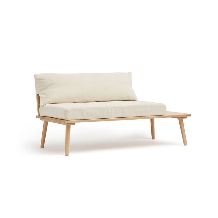 Niska sofa wypoczynkowa ze zintegrowanym stolikiem bocznym. Siedzisko znajduje się po lewej stronie sofy. Przytulne miejsce do czytania i relaksu. Wykonane z drewna z certyfikatem FSC w kolorze jasnego buku z serii Saga.