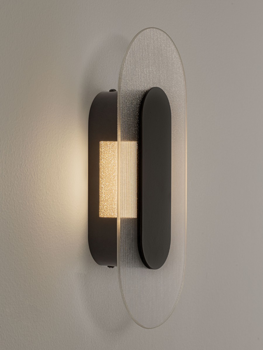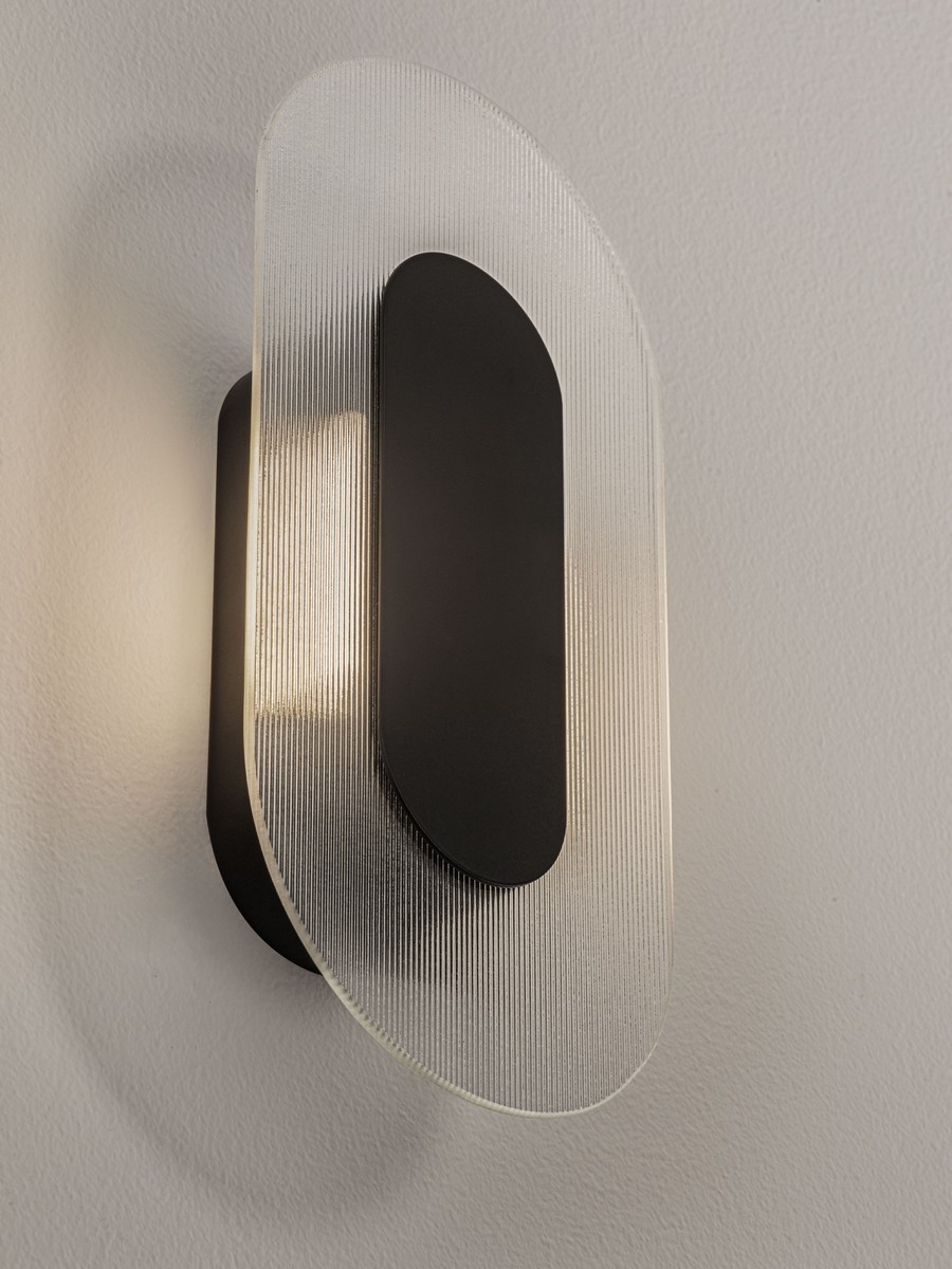 Kinkiet Tacoro o wysokości 30 cm od marki Nova Luce to elegancka oprawa ścienna, która przyciąga wzrok smukłą, podłużną formą i geometrycznym rygorem. Projekt opiera się na owalnej tarczy wykonanej z transparentnego, ryflowanego szkła. W centrum kompozycji umieszczono wydłużony, metalowy detal maskujący, wykończony w głębokiej, matowej czerni. To kontrastowe połączenie materiałów sprawia, że lampa zyskuje nowoczesny, a zarazem niezwykle lekki wizualnie charakter.