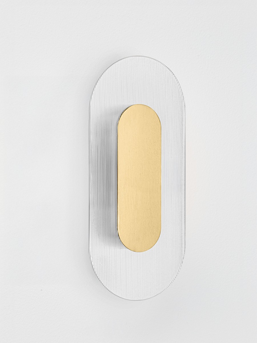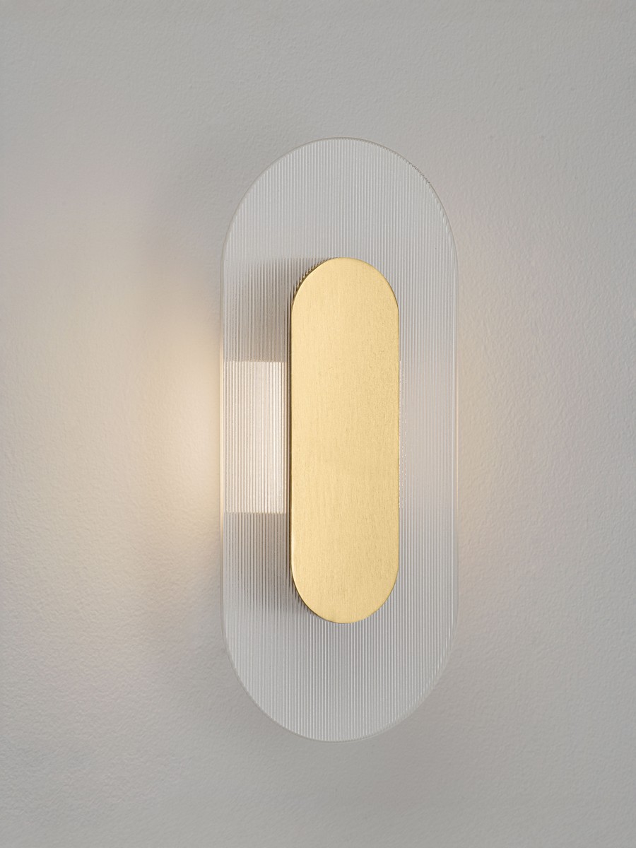 Kinkiet Tacoro o wysokości 30 cm od marki Nova Luce to wyrafinowana oprawa ścienna, która zachwyca smukłą, podłużną formą. Projekt opiera się na wydłużonej, owalnej tarczy wykonanej z transparentnego, ryflowanego szkła. W centrum kompozycji umieszczono gładki, metalowy detal maskujący wykończony w szlachetnym mosiężnym złocie. To wyjątkowe połączenie materiałów sprawia, że lampa zyskuje biżuteryjny, a zarazem niezwykle lekki wizualnie charakter.