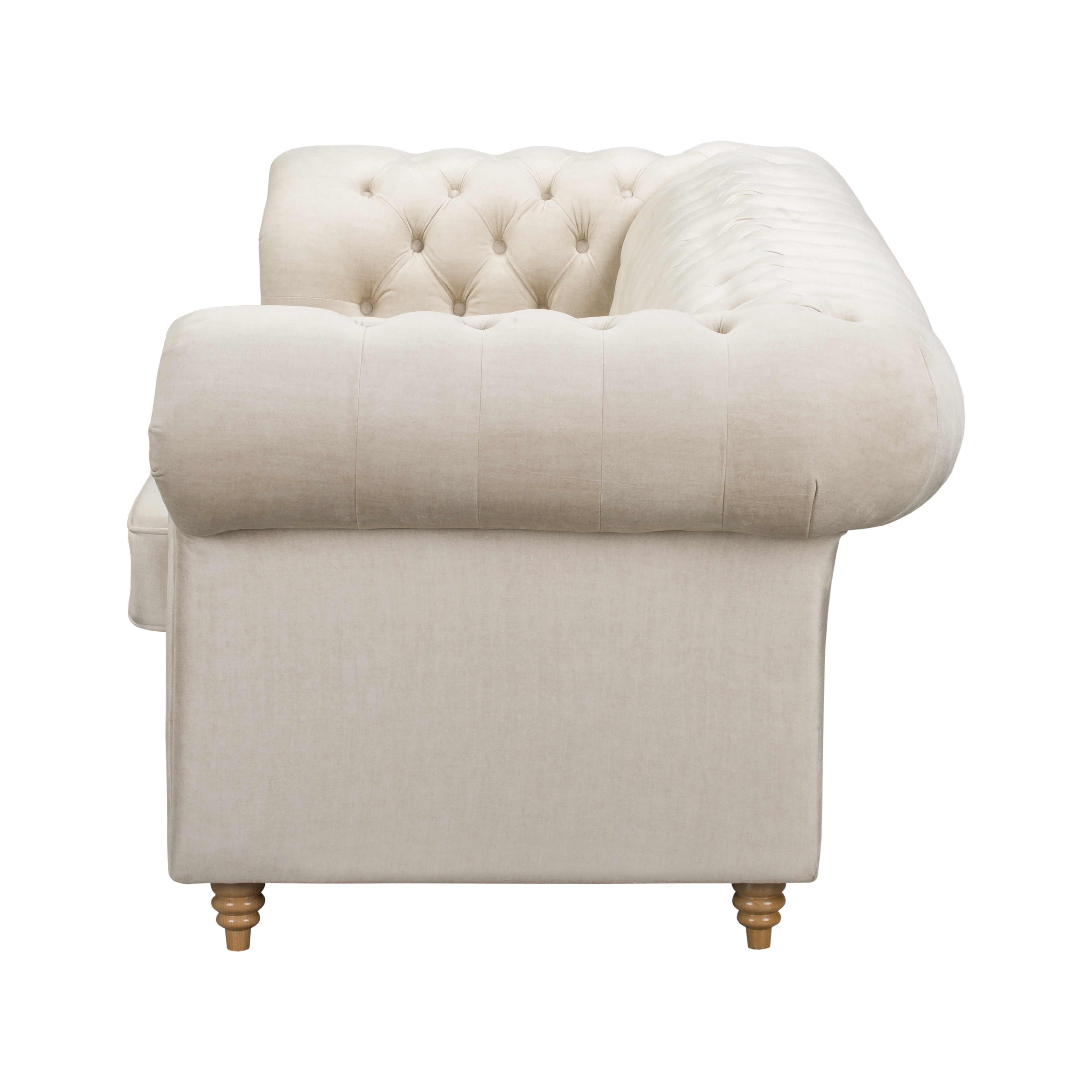Sofa klasyczna Chesterfield Wellington w rozmiarze 2,5-osobowym to idealne połączenie luksusowej elegancji i praktycznej funkcjonalności. Mebel tapicerowany jest tkaniną Vogue 01 w neutralnym, beżowym odcieniu, który doskonale podkreśla jego ponadczasowy design. Cechą charakterystyczną jest głębokie pikowanie na oparciu i podłokietnikach oraz masywne, toczone nogi.