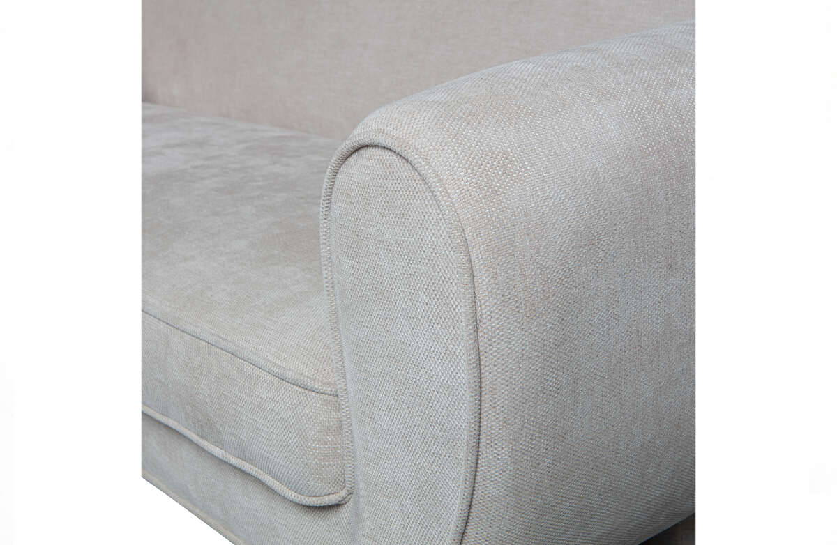 Sofa pokryta została wyjątkową tkaniną Rolo z nicią szenilową, która wyróżnia się miękkością i subtelnym, matowym połyskiem. Ta wysokiej jakości tkanina wykonana jest w 100% z poliestru i charakteryzuje się widocznym splotem i wzmocnieniem w postaci filcowego podkładu. Posiada wynik 80 000 w skali Martindale, co czyni ją odpowiednią do intensywnego użytku domowego.