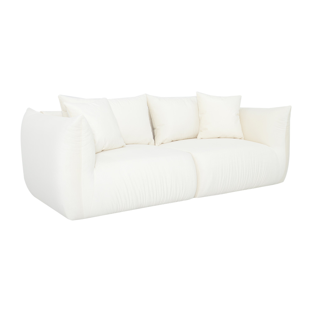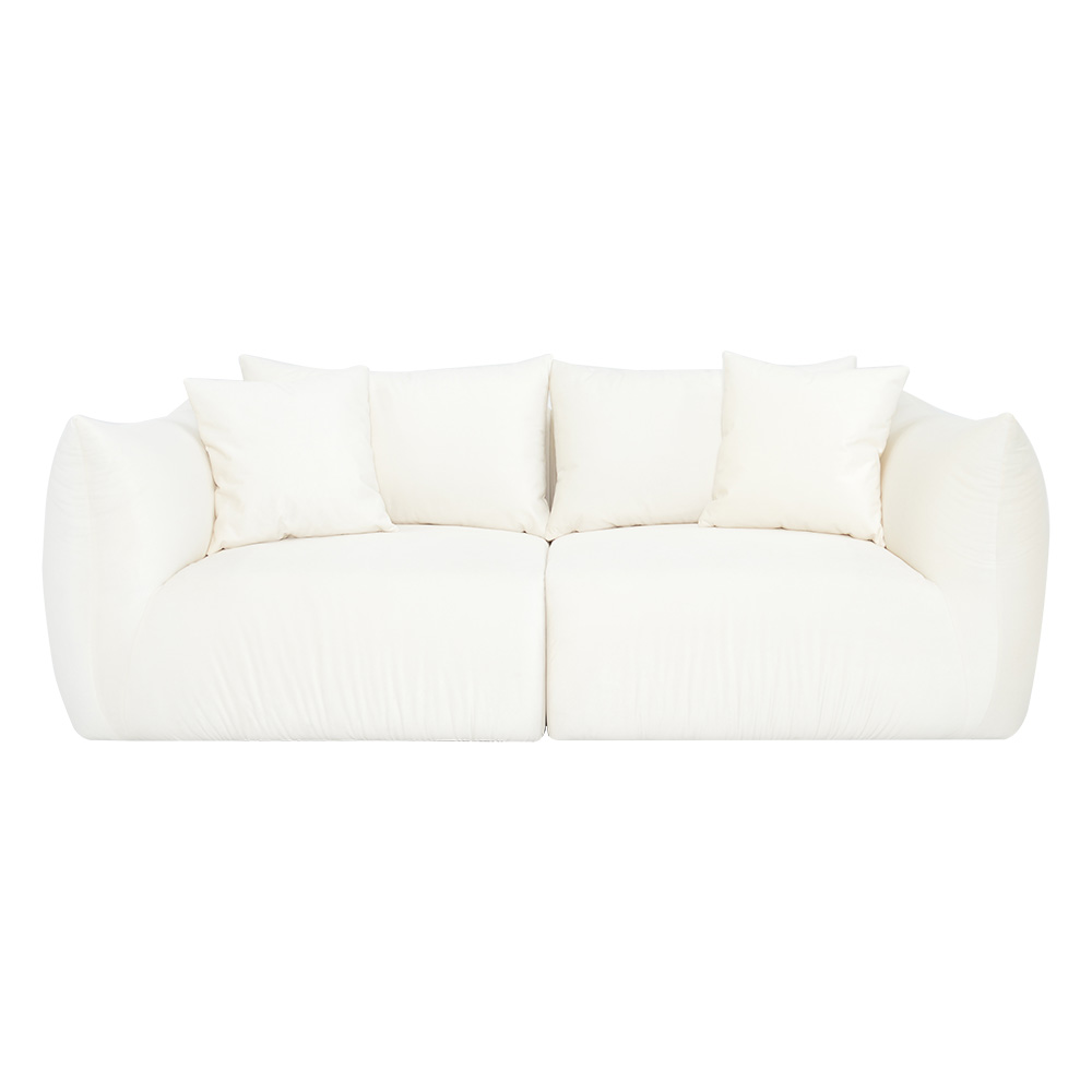 Bryła sofy opiera się na zaokrąglonych liniach i segmentowej konstrukcji, które wprowadzają do wnętrza poczucie przytulności i nowoczesnej harmonii. Głębokie, miękkie siedziska oraz wyprofilowane oparcia otulają sylwetkę, zachęcając do długiego wypoczynku.