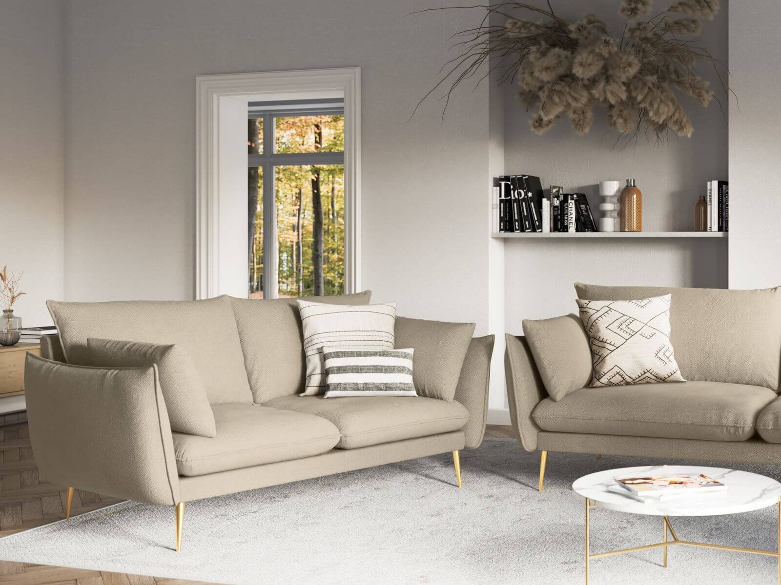 Ta dwuosobowa, beżowa sofa to trafny wybór do wnętrz w stylu skandynawskim, boho, minimalistycznym czy klasycznym.