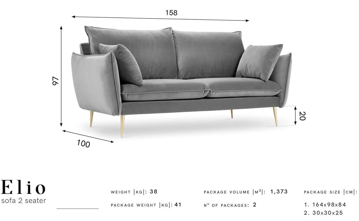 Kolor prezentowanej dwuosobowej sofy Elio to grafitowy - Positano 95 (tkanina) oraz złoty (podstawa). Sofę oferujemy także na czarnych nóżkach oraz w kolorach: jasny beż (Positano 02), ciemny beż (Positano 08), jasny szary (Positano 83), ciemny szary (Positano 87).
