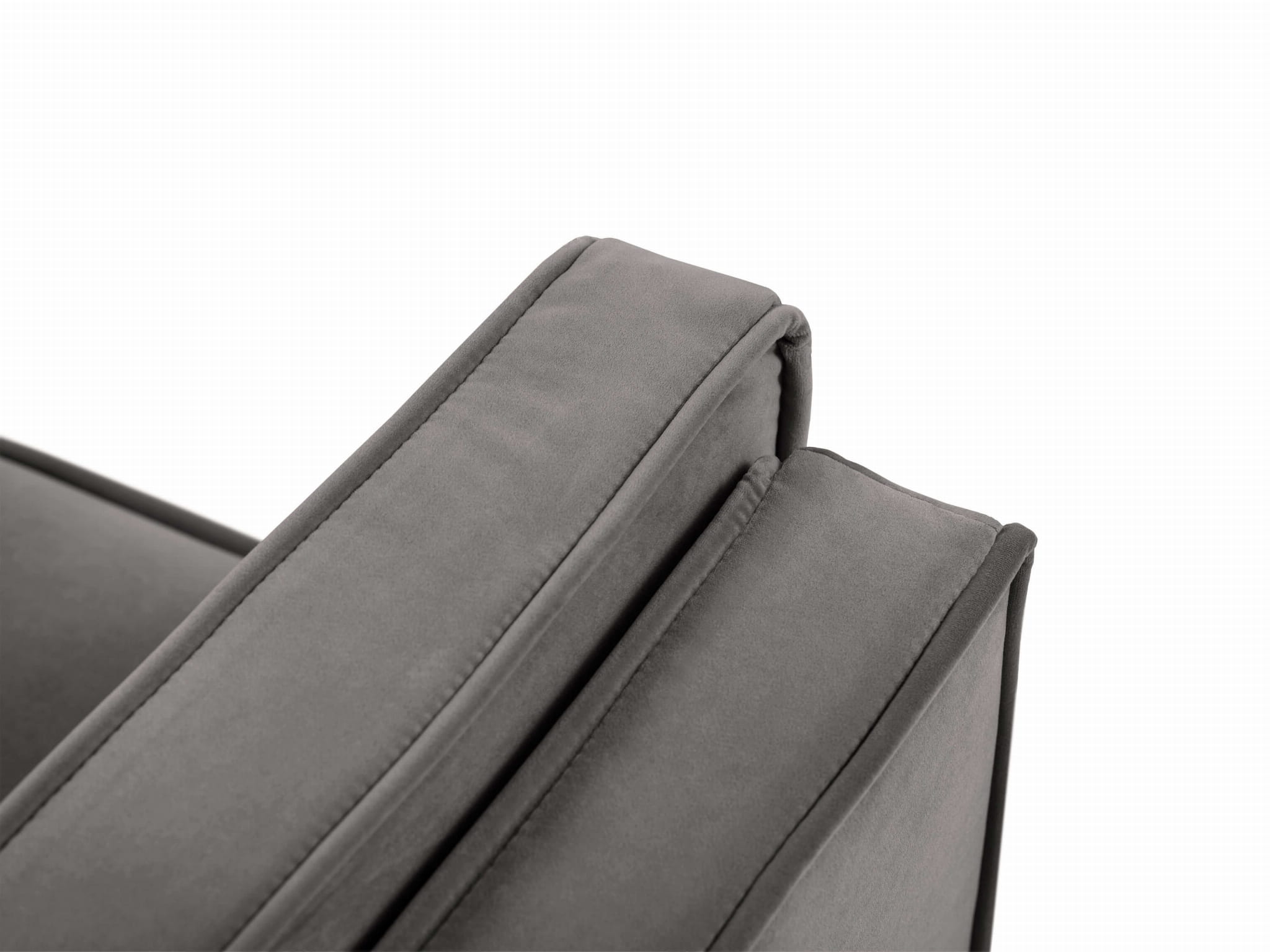 Sofa ustawiona jest na metalowych, geometrycznych nóżkach w kolorze złota. Zachwycają one prostotą wykonania i jednoczesną elegancją. Ulokowanie mebla na smukłych nóżkach sprawa, że nabiera on optycznej lekkości. Zaletą takiego rozwiązania jest także nieograniczony dostęp do przestrzeni pod meblem, a co za tym idzie - ułatwione utrzymanie czystości w pomieszczeniu.