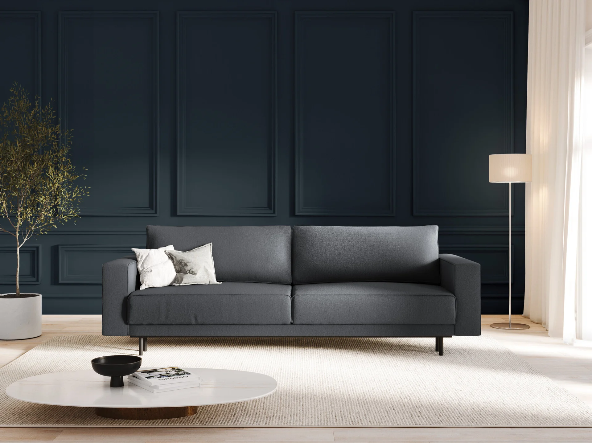 Sofa Caro dostępna jest w szerokiej palecie kolorystycznej, co umożliwia jej dopasowanie do każdego wnętrza. Oprócz tkaniny strukturalnej model ten oferowany jest również w wersji welurowej Bluvel, która zapewnia aksamitne wykończenie i subtelny połysk.