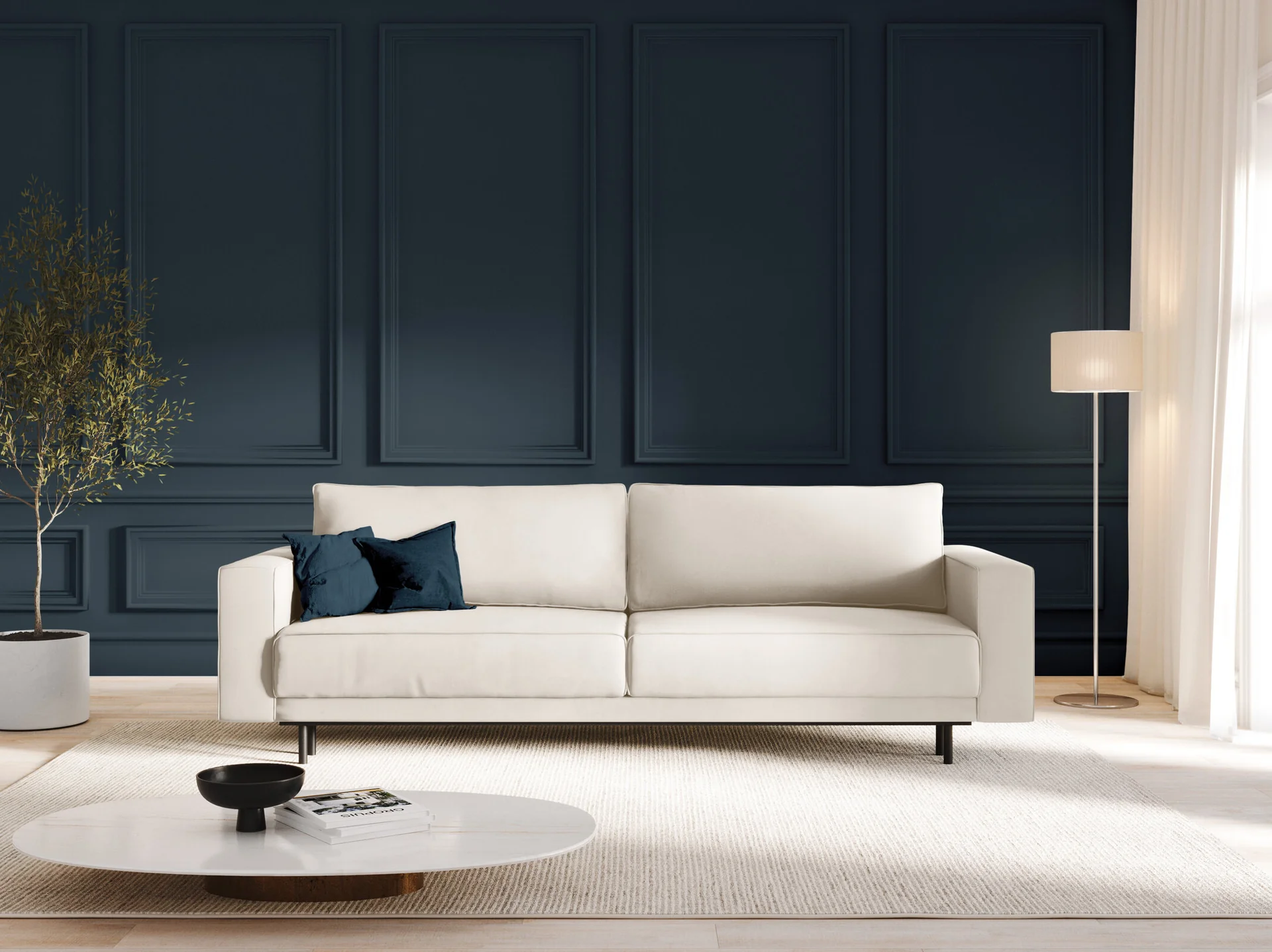 Obicie wykonane jest z welurowej tkaniny Bluvel 22, która zachwyca miękkością, delikatnym połyskiem i aksamitnym wykończeniem. Jej subtelnie zmieniający się odcień w zależności od kąta padania światła nadaje sofie głębi i luksusowego wyglądu. Wysoka odporność na ścieranie (Test Martindale’a: 50 000 cykli) sprawia, że tkanina pozostaje w świetnym stanie przez lata. Dodatkowo, materiał pozytywnie przeszedł test papierosowy, co oznacza, że spełnia normy bezpieczeństwa PN-EN 1021-1:2014-12.