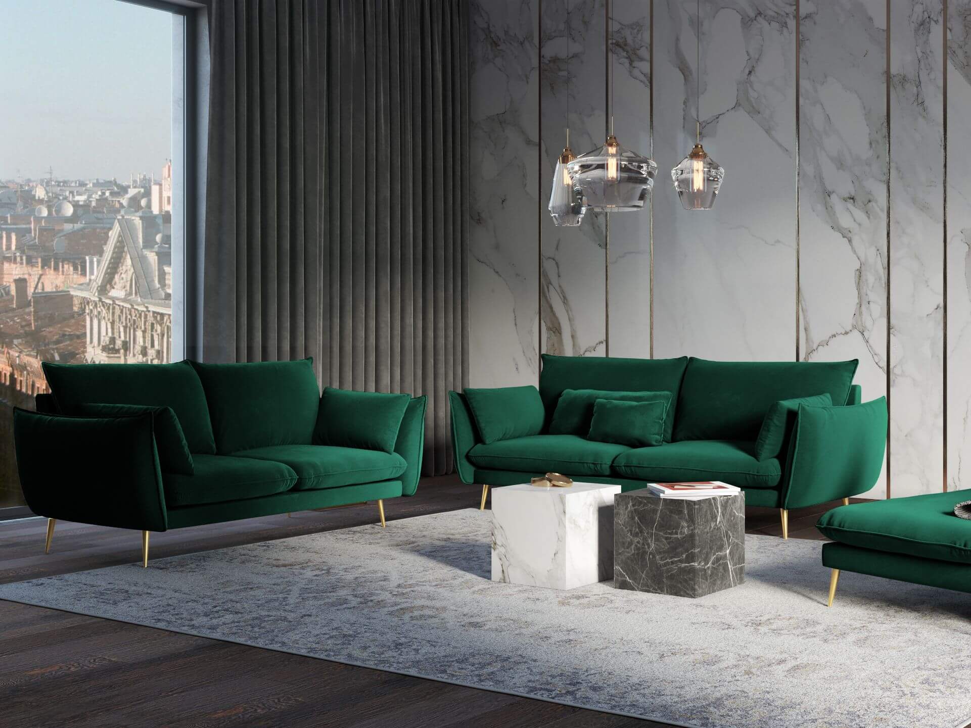 Sofa 3-osobowa Elio butelkowa zieleń aksamit złote nóżki