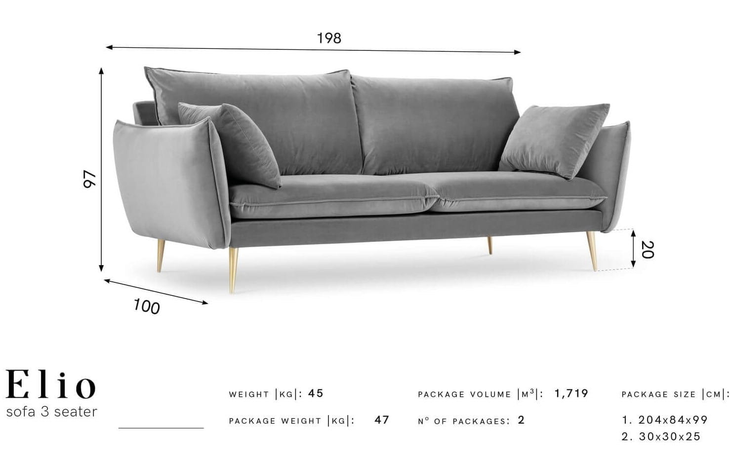 Trzyosobowa sofa Elio to mebel reprezentujący klasę i wysoki komfort wypoczynku. Oprócz cech użytkowych przejawia także walory estetyczne, za sprawą których Twoje wnętrze nabierze przytulnej elegancji.